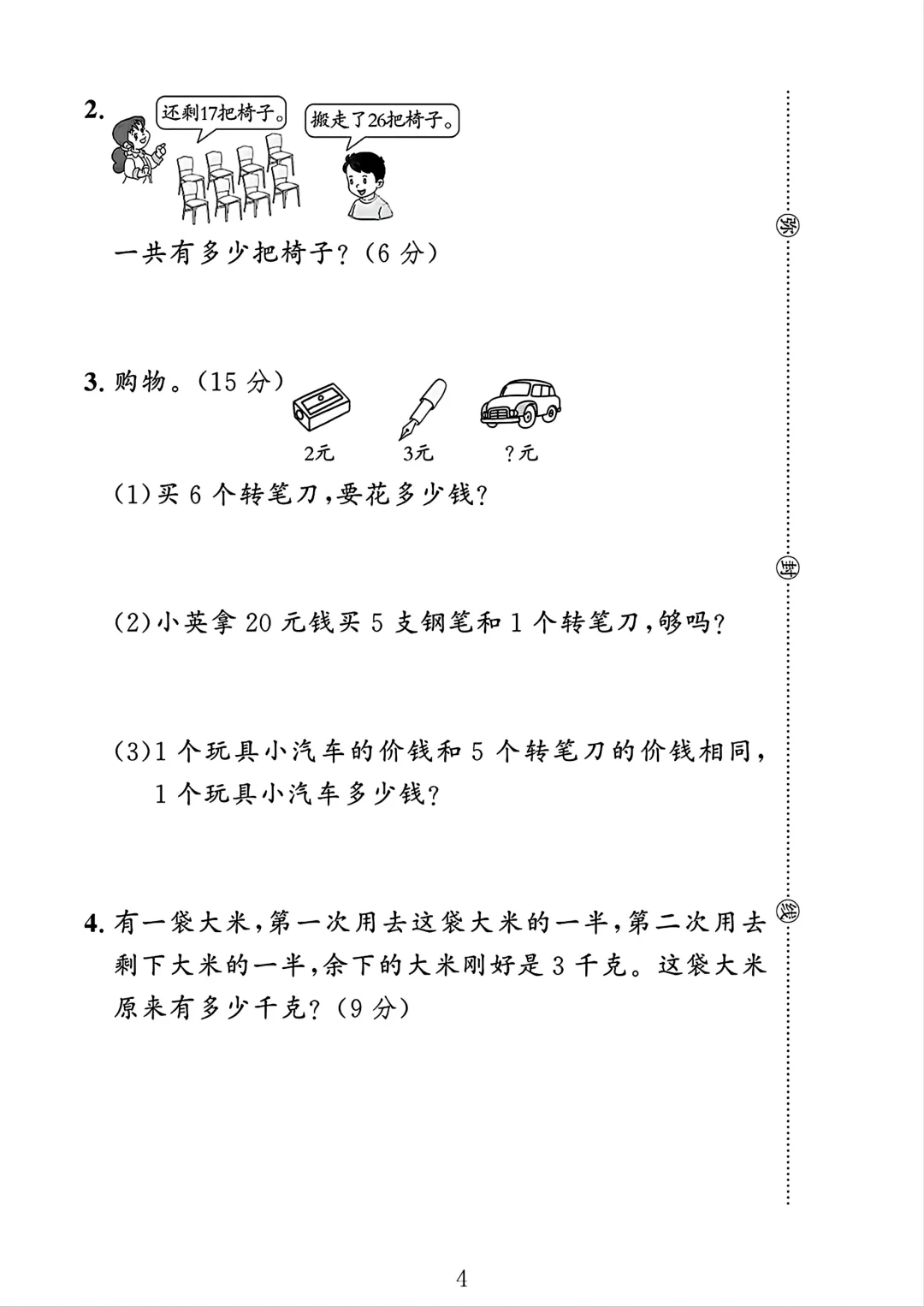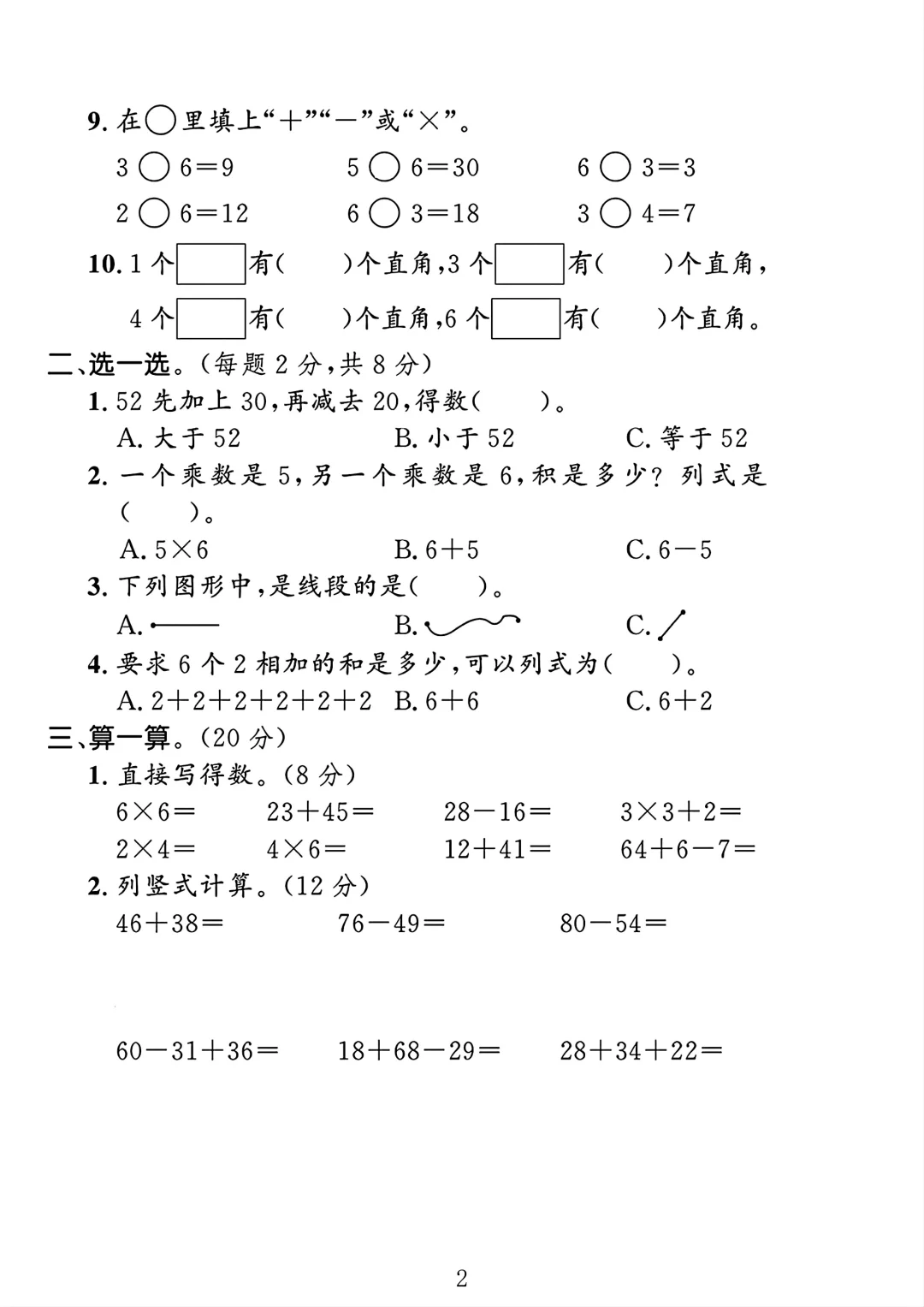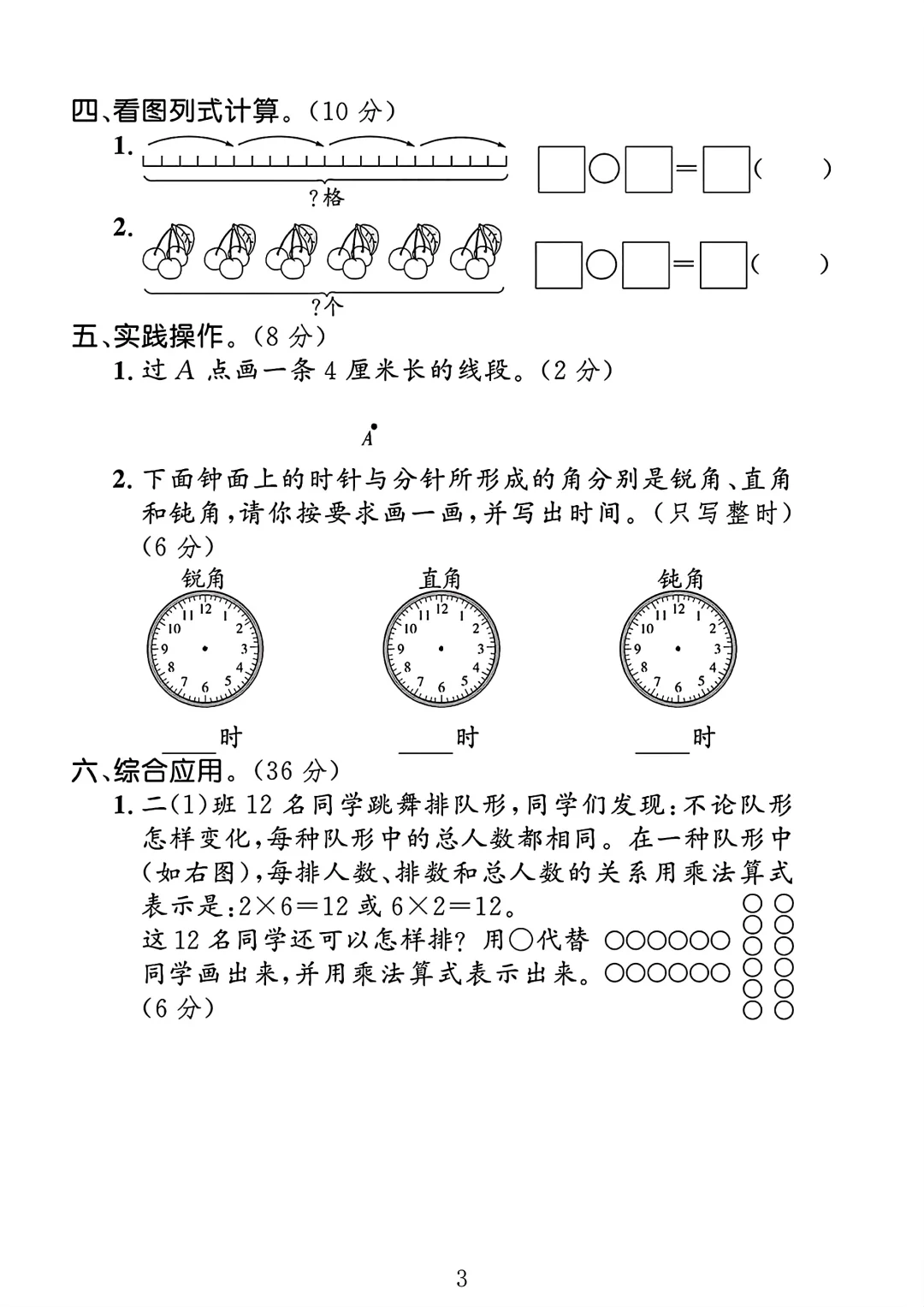 人教版 二年级上册数学 期中试卷 期中考试 电子版可打印 试卷