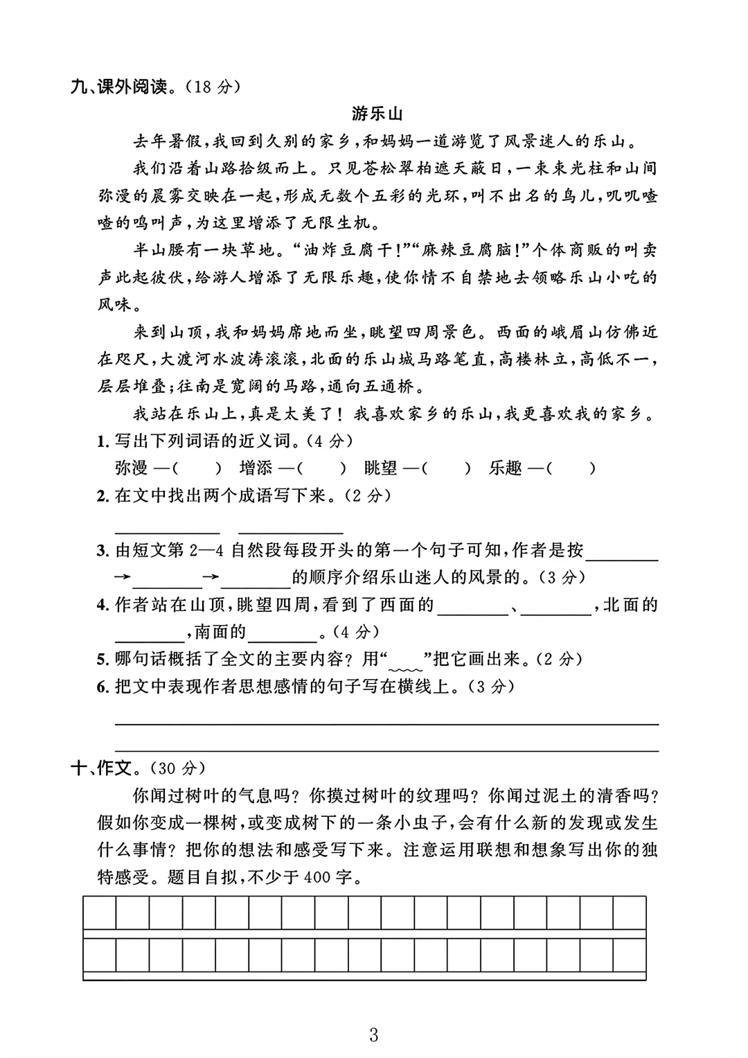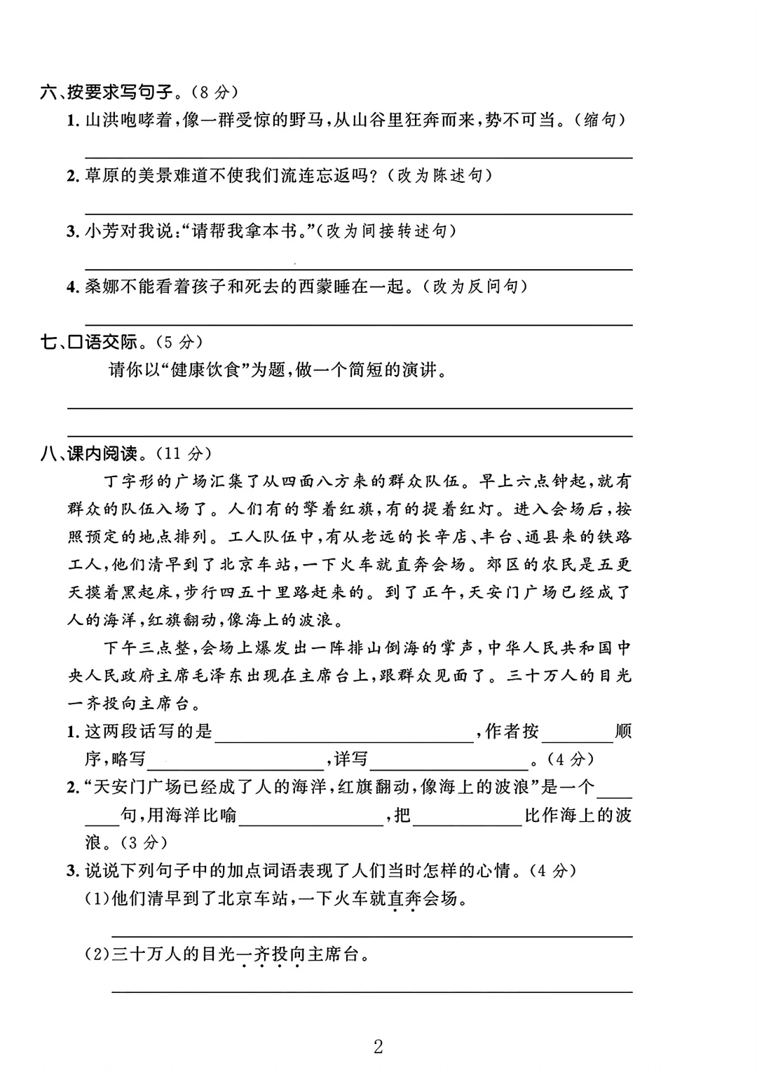 人教版 六年级上册语文 期末试卷 期中考试 电子版可打印 试卷