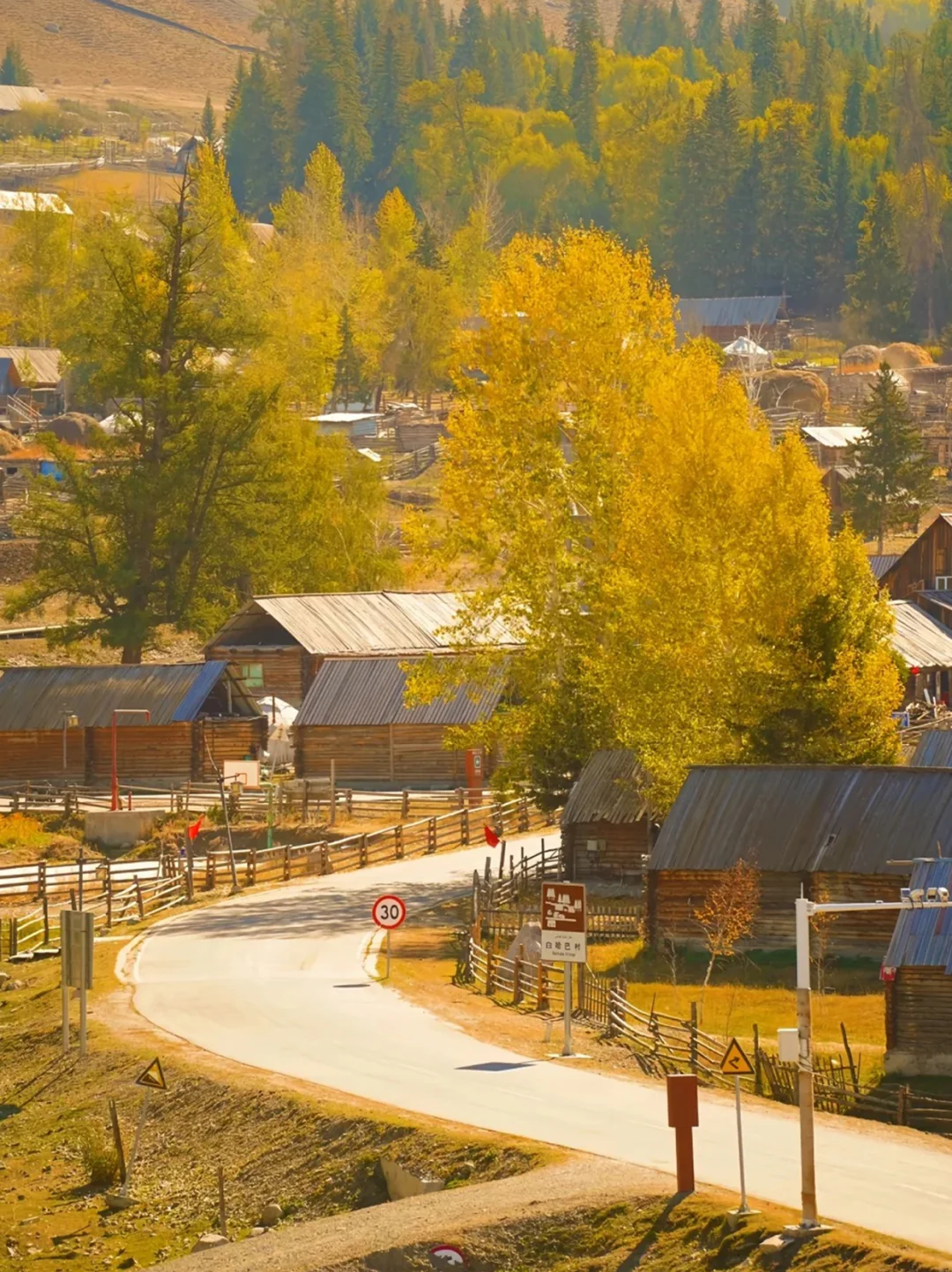 🟠禾木村:成排的木屋炊烟袅袅,在金黄的白桦林照耀下,宛如童话世界