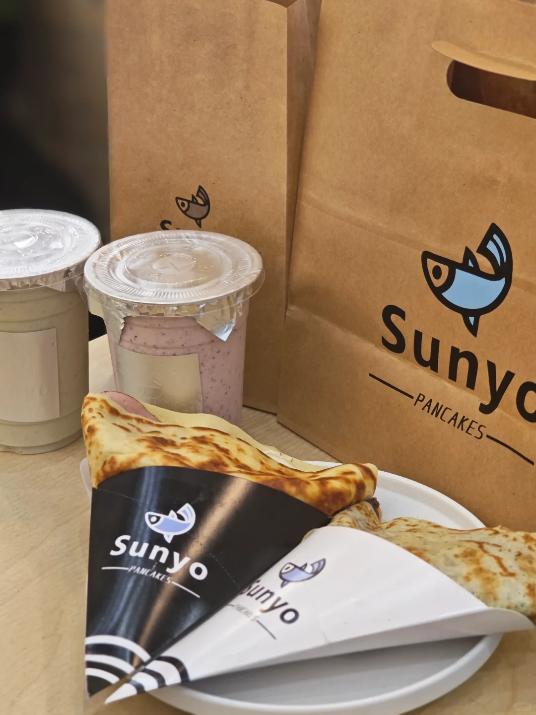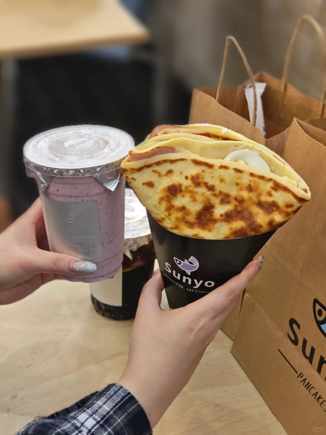 💕发现一家超棒的可丽饼店——Sunyo Pancakes! 🥞菠菜火腿鸡蛋芝士酸奶油可丽饼简直是味蕾的盛宴!菠菜的清新、火腿的咸香、鸡蛋的嫩滑、芝士的浓郁和酸奶油的醇厚完美融合,一口下去,想迷糊了😋。 🥤搭配上一杯树莓蓝莓奶昔,清爽的口感与可丽饼相得益彰,让整个味觉体验更上一层楼💯。 🙌这家店真的是我的心头爱,强烈推荐给大家!一般人我不告诉他😍!