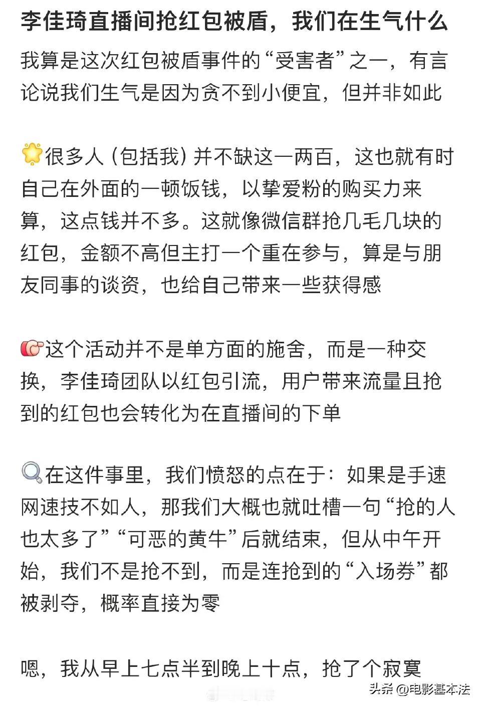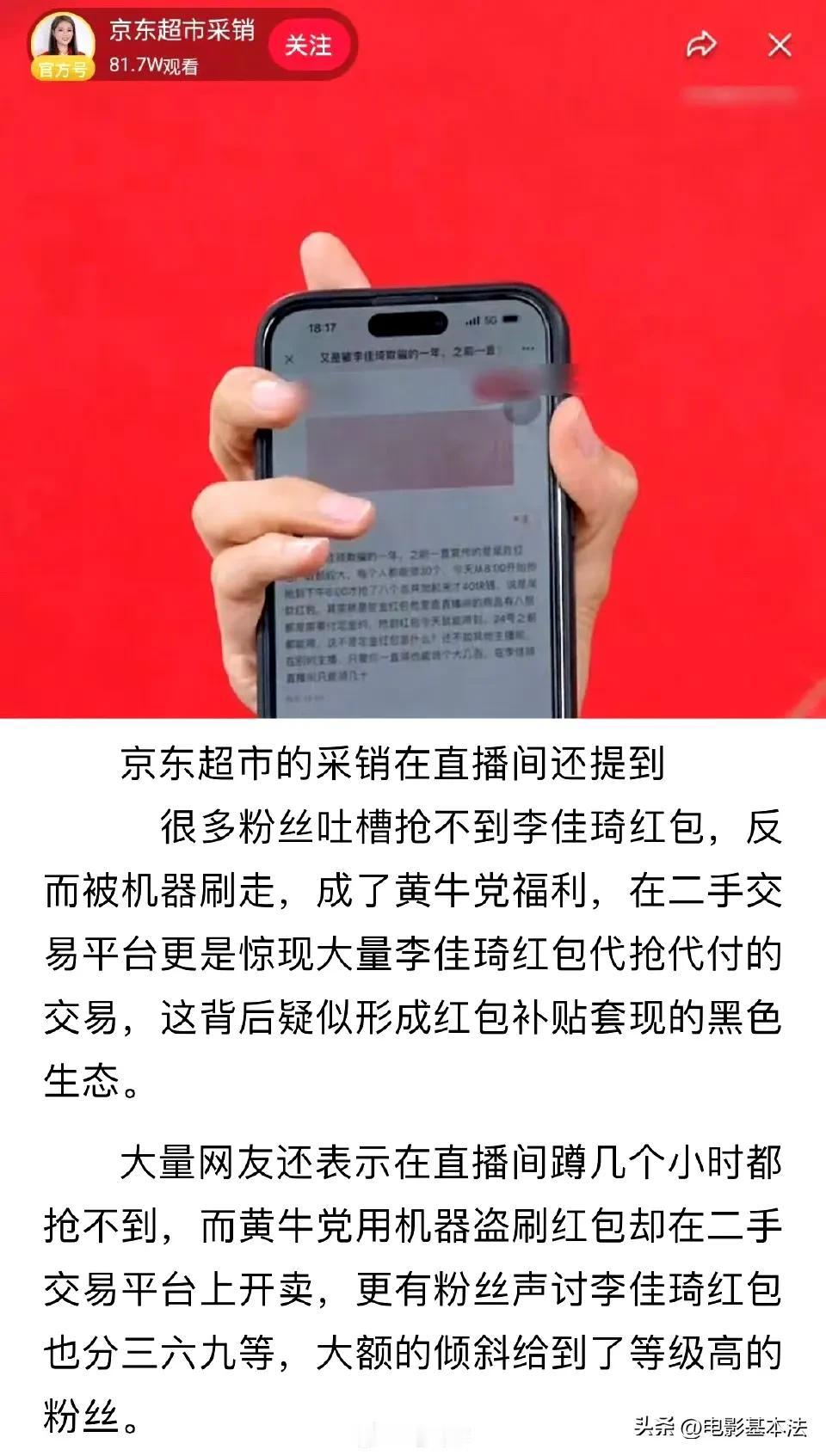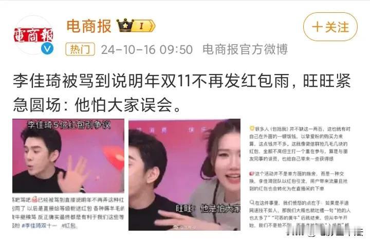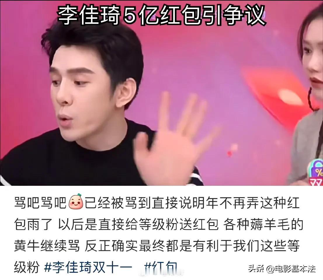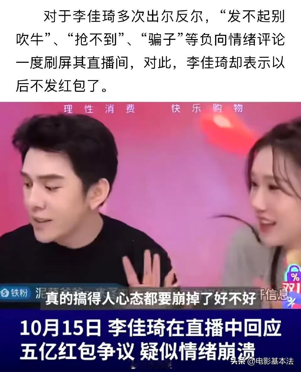 李佳琦,摊上大事了! 10月17日,顶流带货主播李佳琦冲上热搜,原因是他被京东超市的采销以及众多网友炮轰“虚假承诺”、“是骗子”…… 原来,此前李佳琦在直播间曾经当众承诺,10月14日双十一预售将在直播间发9亿红包,直播15小时每5分钟发500万红包,还让粉丝14号天亮就去抢红包。 但是后来李佳琦又改口,不再是9亿,也不再是直播15个小时,而是在14日、15日两天,红包总金额也缩水到了5亿,而且也不再是每5分钟发,而是不定时发。 很多网友表示,李佳琦直播间根本抢不到红包,都被机器刷走了,在二手交易平台更是发现了黄牛党大量李佳琦红包代抢代付的交易,疑似是李佳琦方面自己发,自己用软件抢。 网友们看后纷纷评论: 根本不是红包,不是现金,而是打折券。 继续作妖,要不是那么多女生去买,早晚凉凉。 自己发,自己用软件抢,厉害。 没在直播间买过东西,这种直播带货真的便宜吗? 消费者失望。 支持打倒二道贩子。 预热半天抢红包,实际根本抢不到,搞什么? …… 随后李佳琦很生气,完全不认可网上关于他的负面说法,表示明年不再弄红包雨了,以后直接按等级给粉丝发红包。 随后京东超市采销出面“炮轰”李佳琦这种做法。 也有很多网友对京东的做法表示质疑: 老传统了,去年踩了一波,今年接着来。 一个大公司去踩一个小主播,年年双十一蹭热度。 某东年年搞这些,自己不行就一直耍阴招。 …… 孰是孰非不敢妄下定论,但是某东确实缺头部主播,某宝有李+7,某音有三只🐑和董圣,某手有狮子王,大电商平台只有某东缺一块金字招牌。 在下有个建议,不如让奶茶妹妹亲自直播,频率不能高,高了太掉价,每个月一次就够了,直播的时候带带旗下有潜质的主播,说不定很快就能诞生顶流主播了。