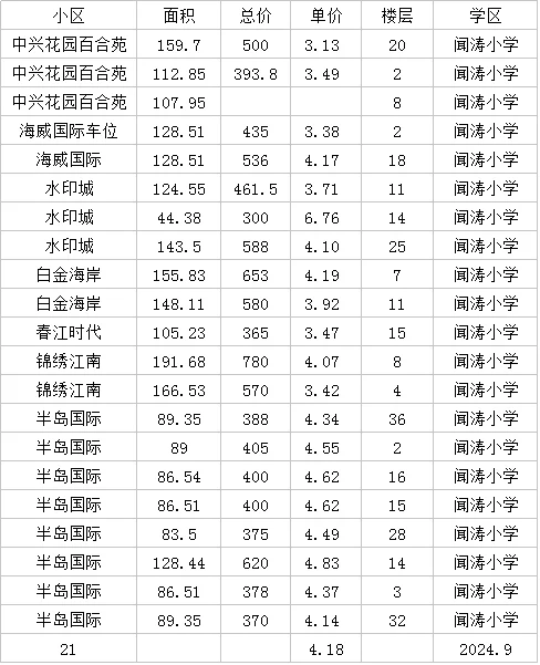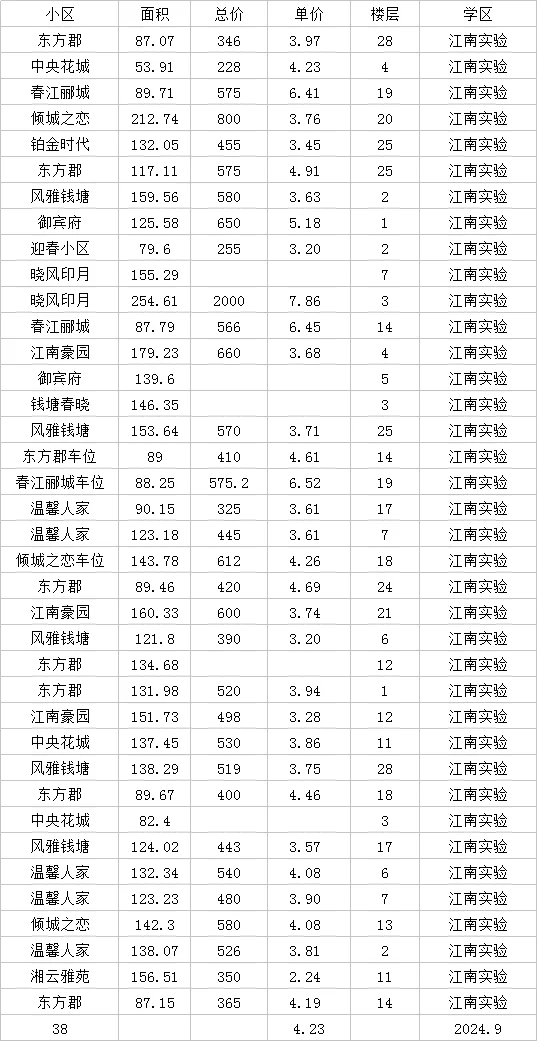 江南实验9月成交明细 闻涛小学9月成交明细 滨江实验9月成交明细
