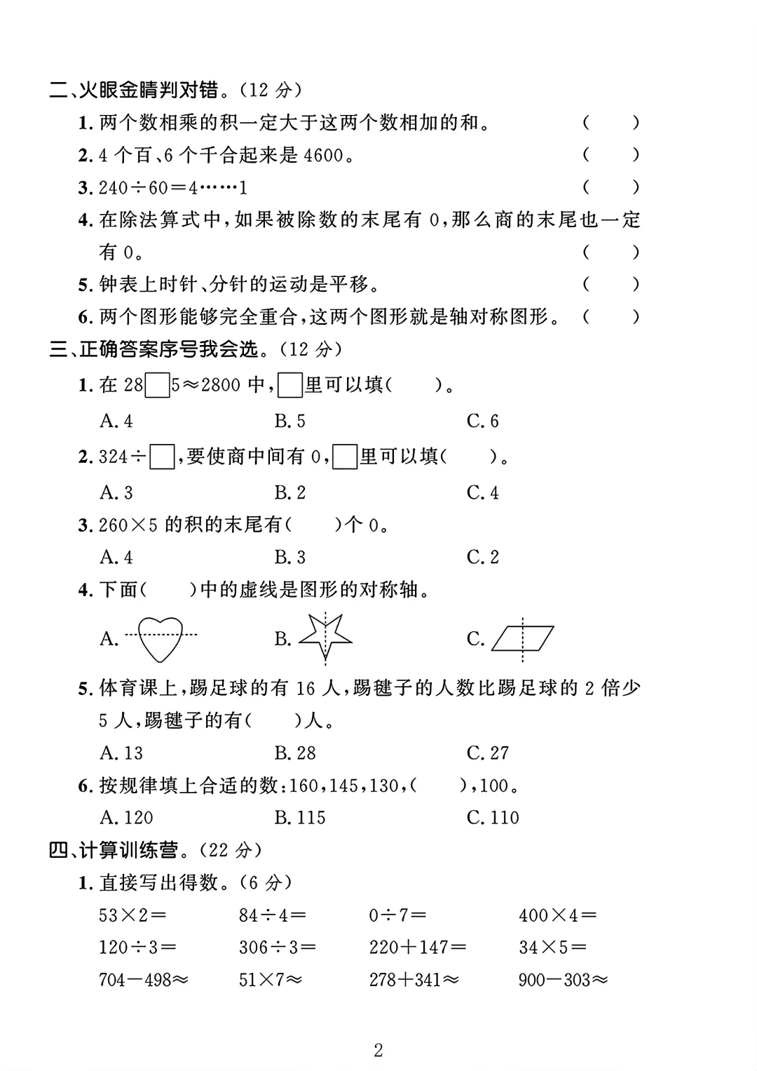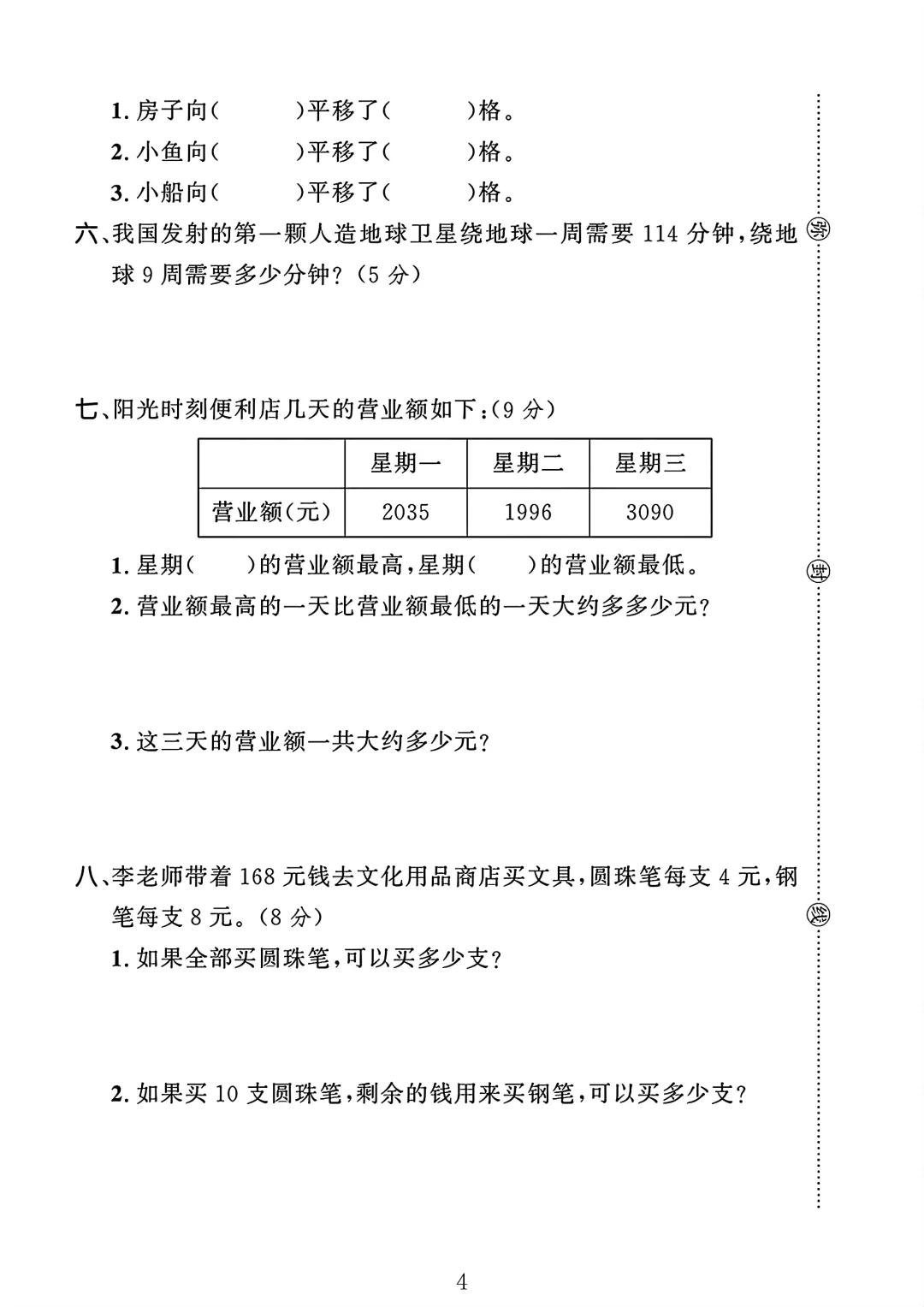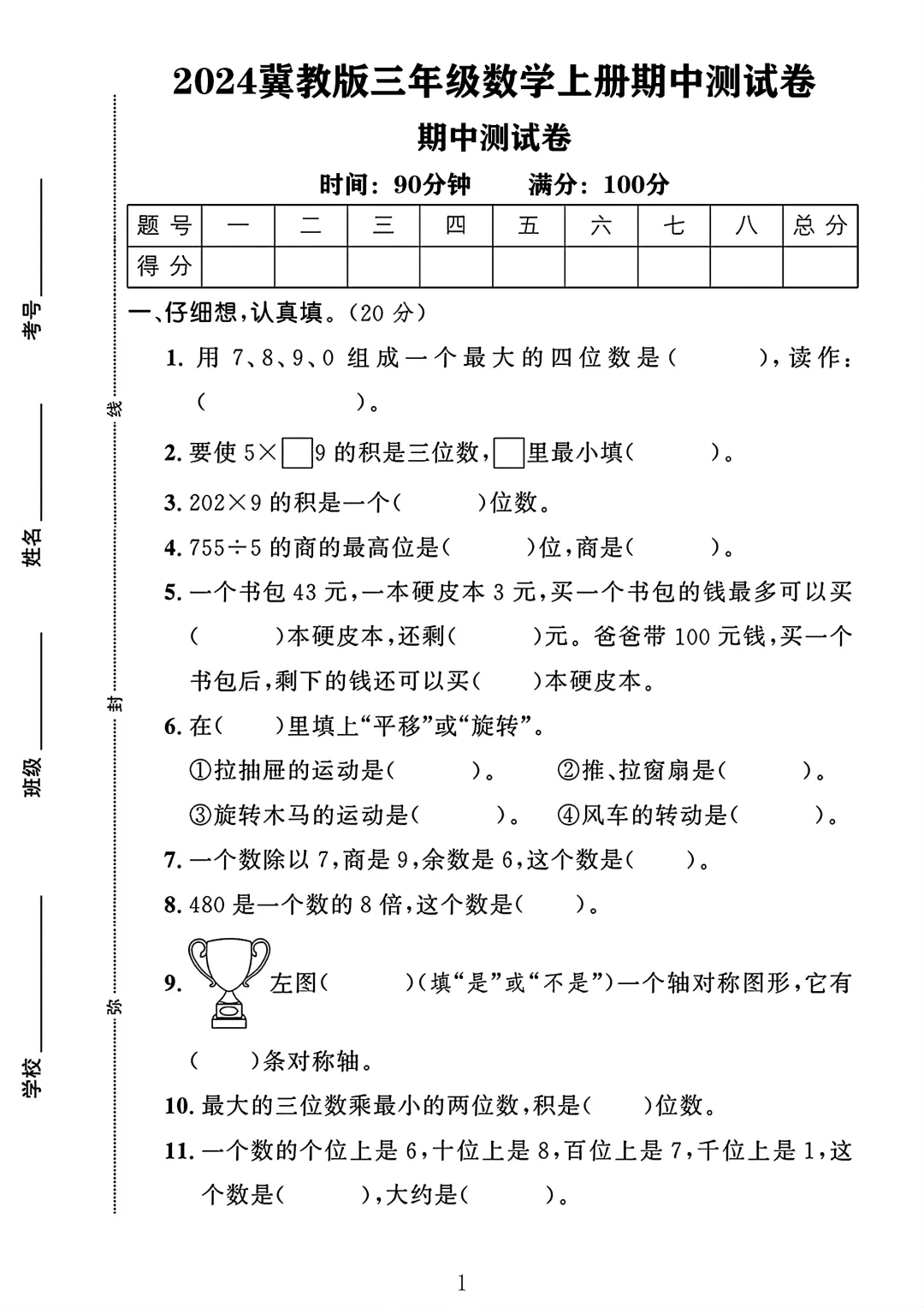 冀教版 三年级上册数学 期中考试 期中试卷 期中测试卷 电子版可打印