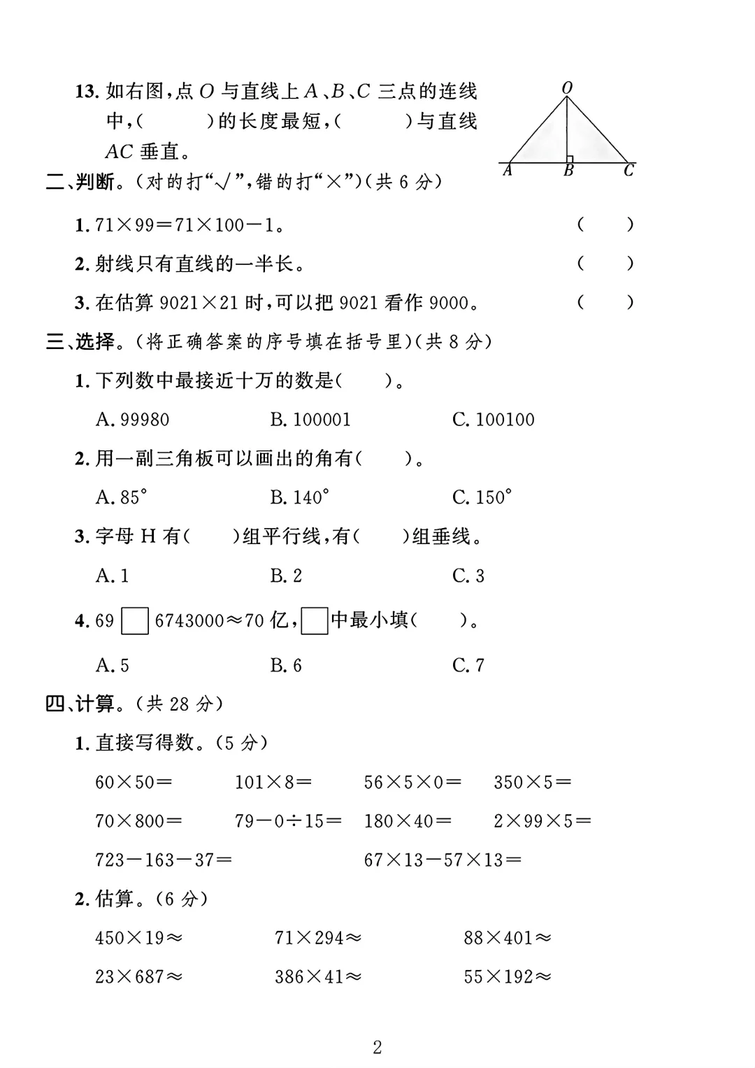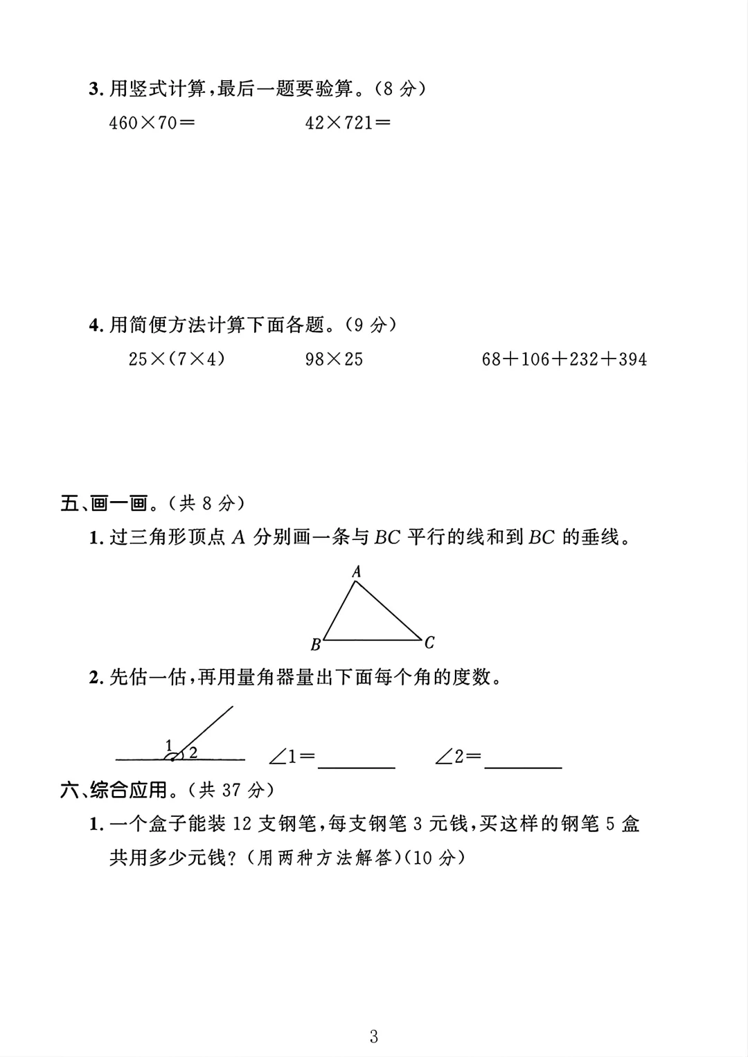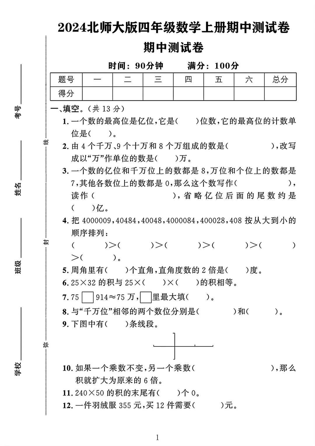 北师大版数学 四年级上册数学 期中试卷 期中考试 期中复习 电子版可打印