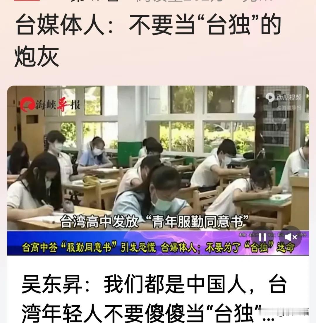 听到湾湾女生嗲嗲的声音:“我觉得好糟糕哦!为啥要我签这种东西”,这种声音太好听了,多位湾湾高中生好情绪激动哦!纷纷拒签“战时服勤同意书”。 这就对了,这风向标就是正确的。湾湾人民包括年轻一代爱和平,不愿打仗,不愿给台独分子当炮灰。网友说:先抓赖清德在美国的儿子回来签。
