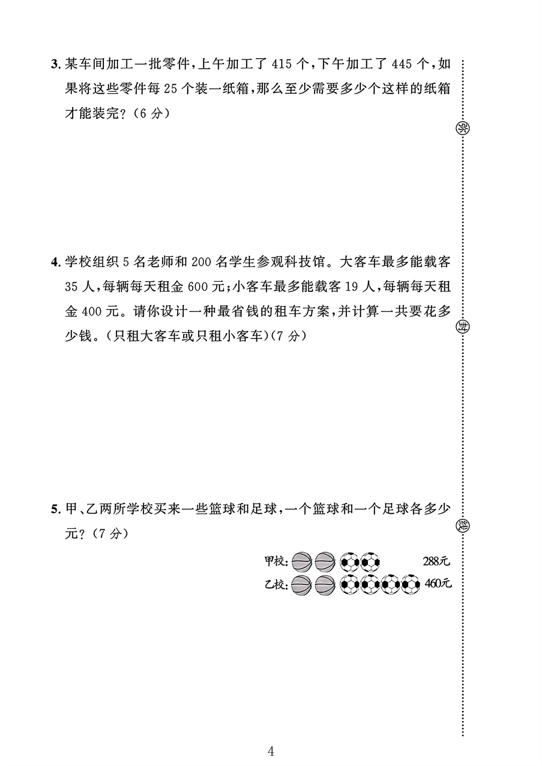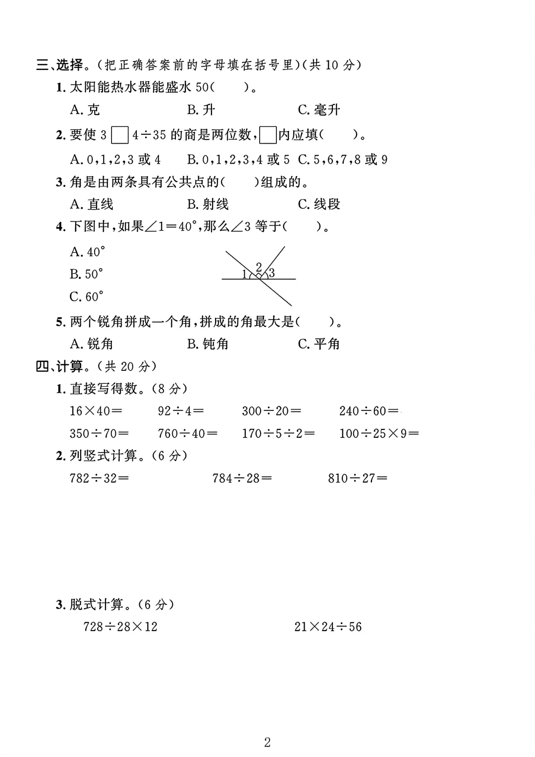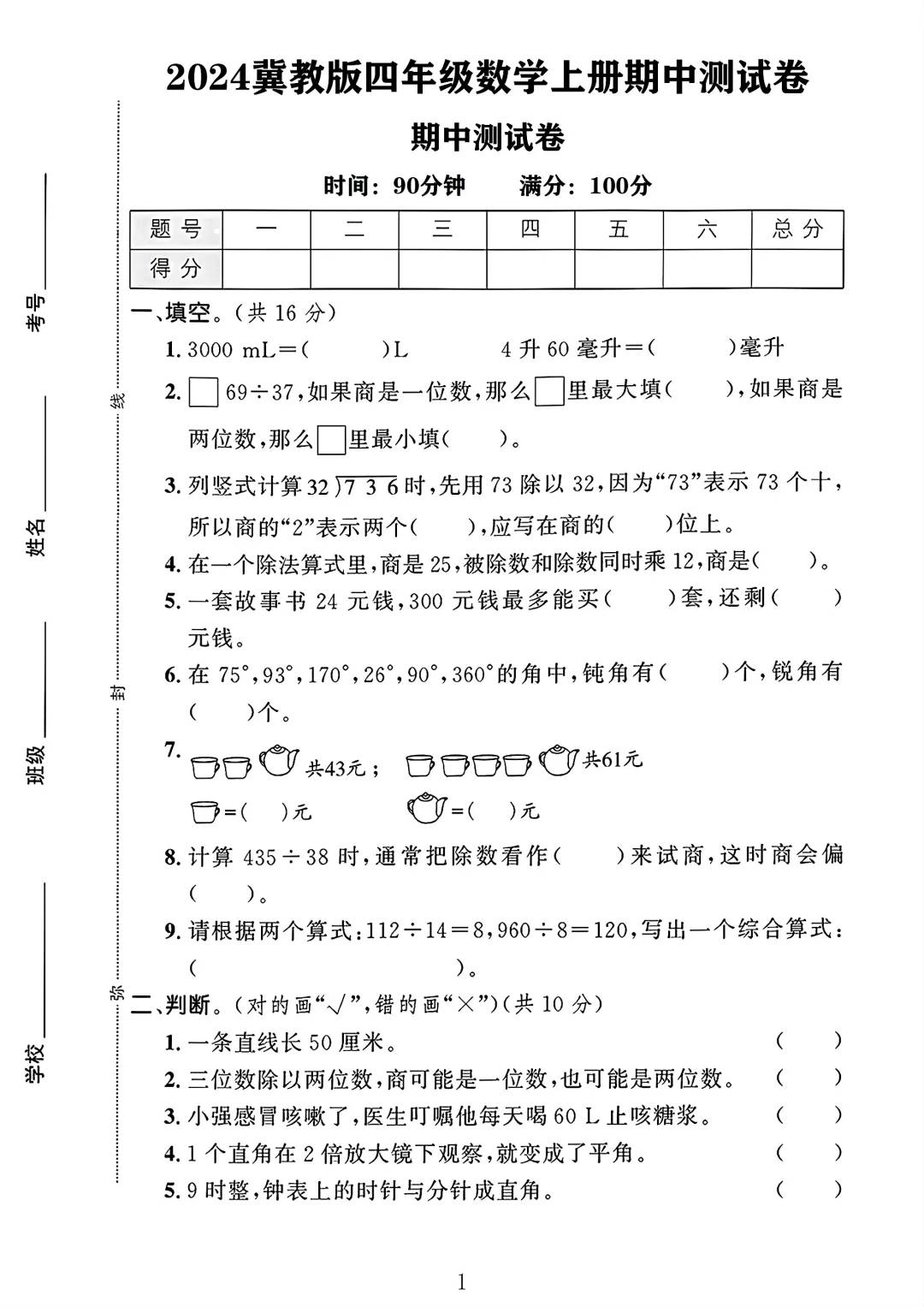 冀教版 四年级上册数学 期中试卷 期中考试 电子版可打印