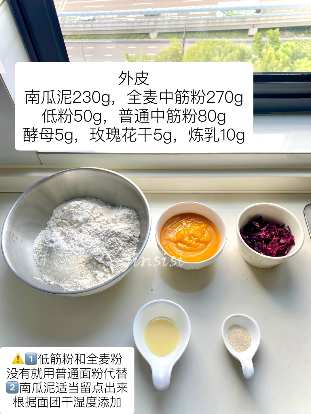 南瓜泥230g,全麦粉270g,低粉50g