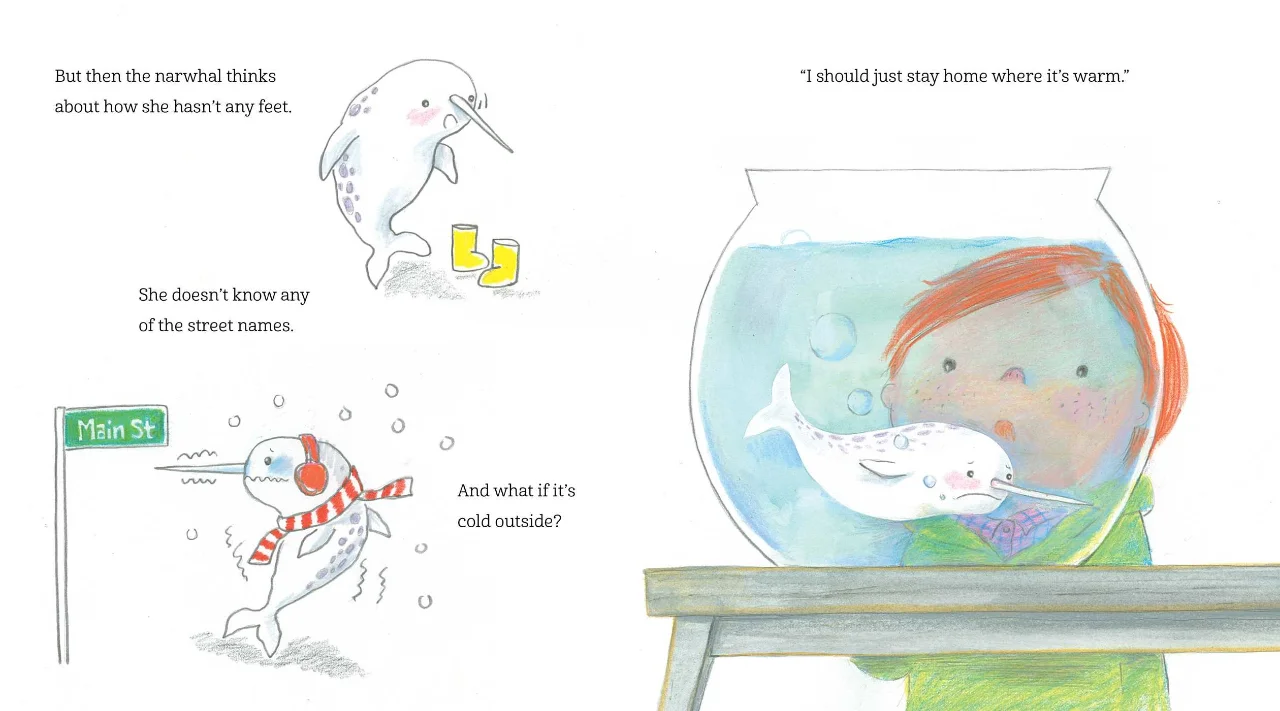 从鱼缸里看出去,世界一点也不有趣。鱼缸里的小小独角鲸,梦想探索宽广世界──无穷无尽的蓝天、高高的建筑,还有各式桥梁。可是,小小独角鲸没有脚,也不认识路。再说,万一外头很冷的话,又该怎么办呢?