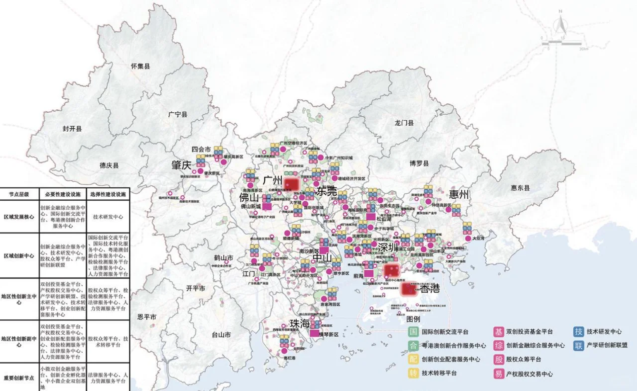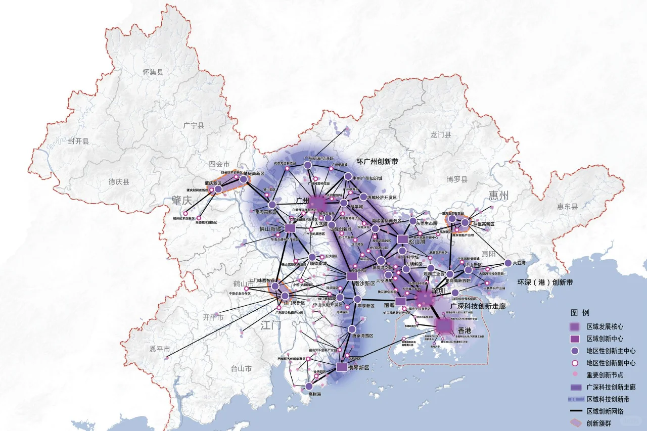 规划形成“两核、五副”、 “一廊、两带”、 “多节点、簇群式、网络化”的创新发展格局。其中:两核包括广州中心区、深圳中心区;五副(五大区域创新中心)包括广州南沙新区、深圳前海、珠海横琴新区、佛山新城、东莞松山湖;一廊是指广深科技创新走廊;两带是指环广州、环深(港)两条科技创新发展带;以“广、深”为核心,以区域创新中心、地区性创新主中心、地区性创新副中心、重要创新节点等不同层级节点为支撑。以广深科技创新走廊为脊梁,围绕“两核、五副”向外辐射,形成功能互补、层级完善的区域创新网络。