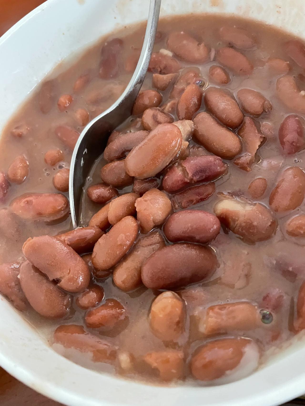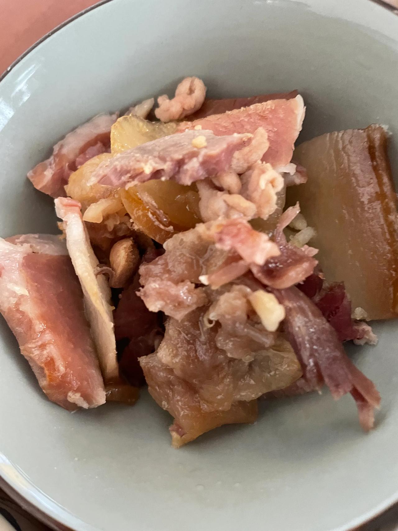 今天午饭🥣 苞谷米饭、火腿、红豆汤、莲花白、炒肉。