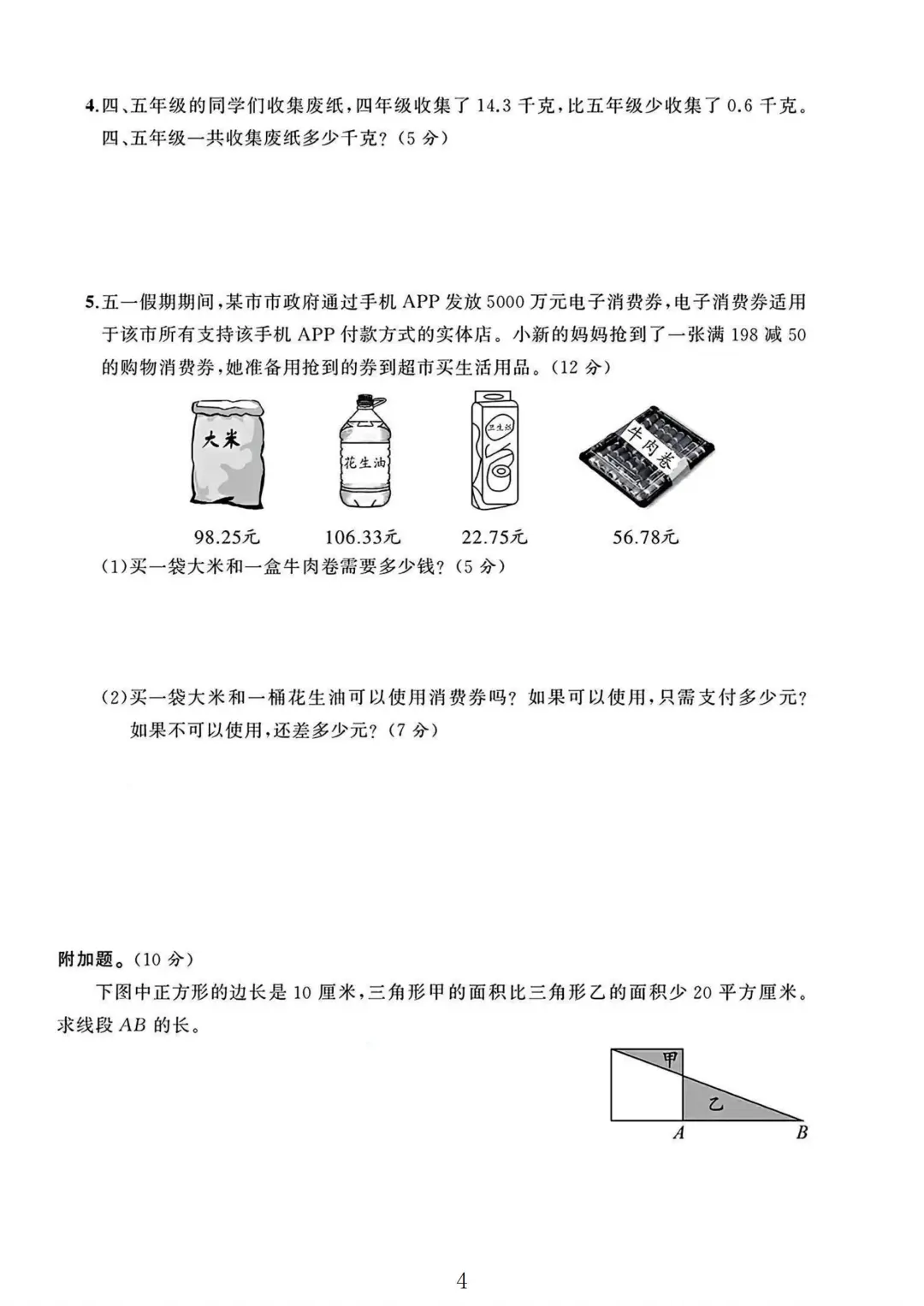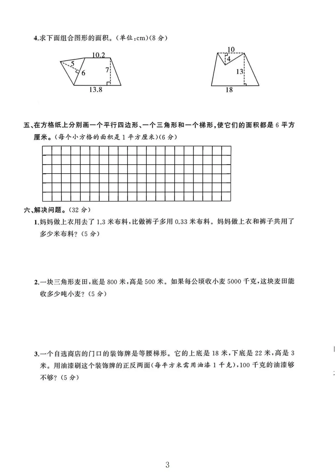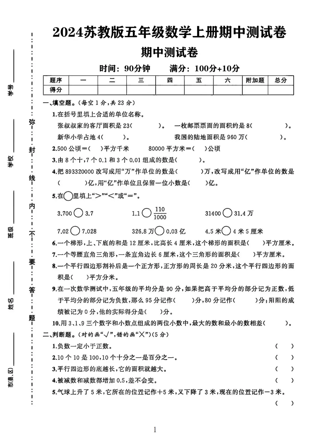 苏教版 五年级上册数学 期中考试 期中试卷 电子版可打印 试卷