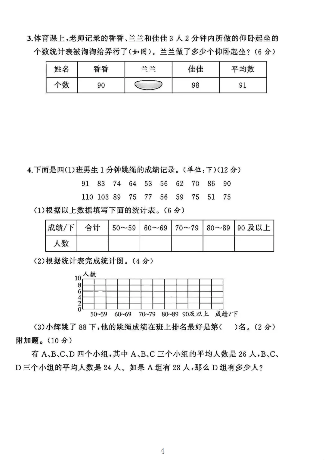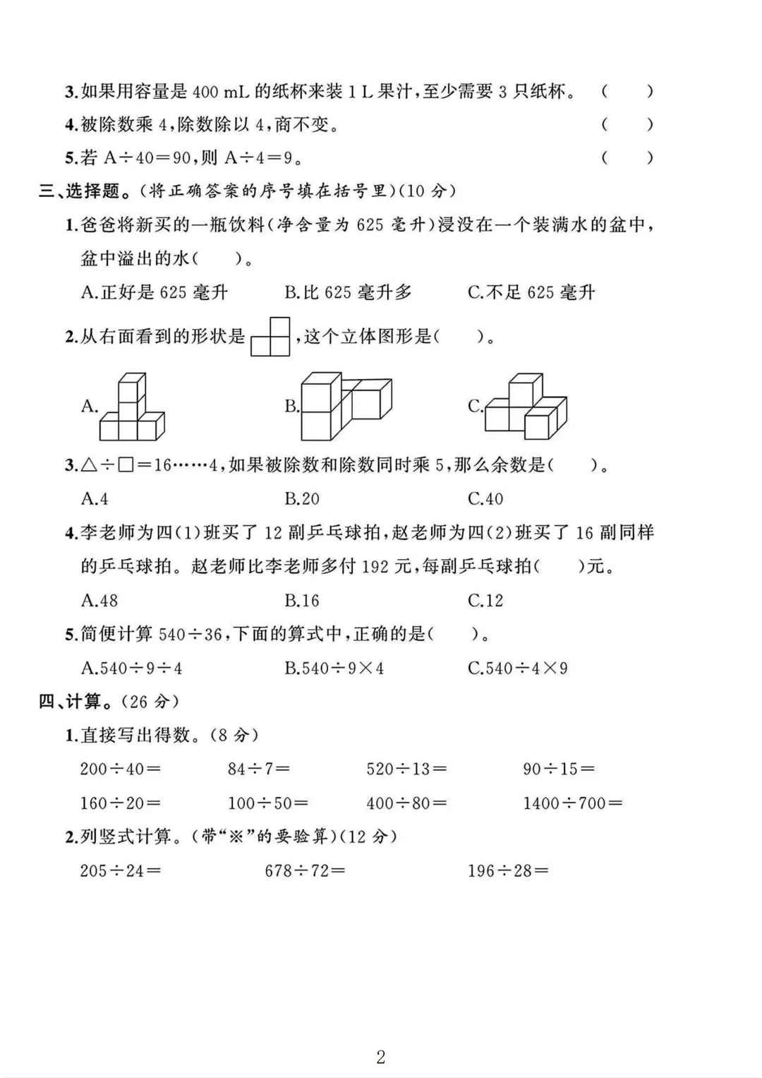 苏教版 四年级上册数学 期中考试 期中试卷 电子版可打印 试卷