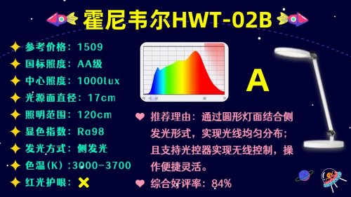 儿童护眼台灯什么品牌最好?霍尼韦尔HWT-02B护眼台灯采用上下双圆形灯头设计,配备双旋转轴结构,可灵活调整照明角度,适应不同的桌面高度和使用姿势。其圆形发光面直径约17厘米,照明范围可覆盖约1.2米宽的桌面,满足日常学习和办公需求。光源采用类太阳光全光谱技术,显色指数达到Ra98,能较真实地还原物体色彩,不会出现偏色的现象。需要注意的是定价较高,比较适合预算充足的家庭选择。