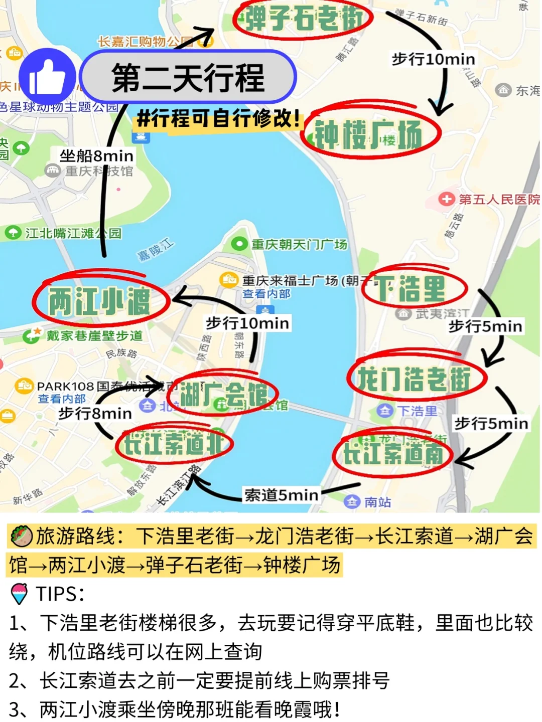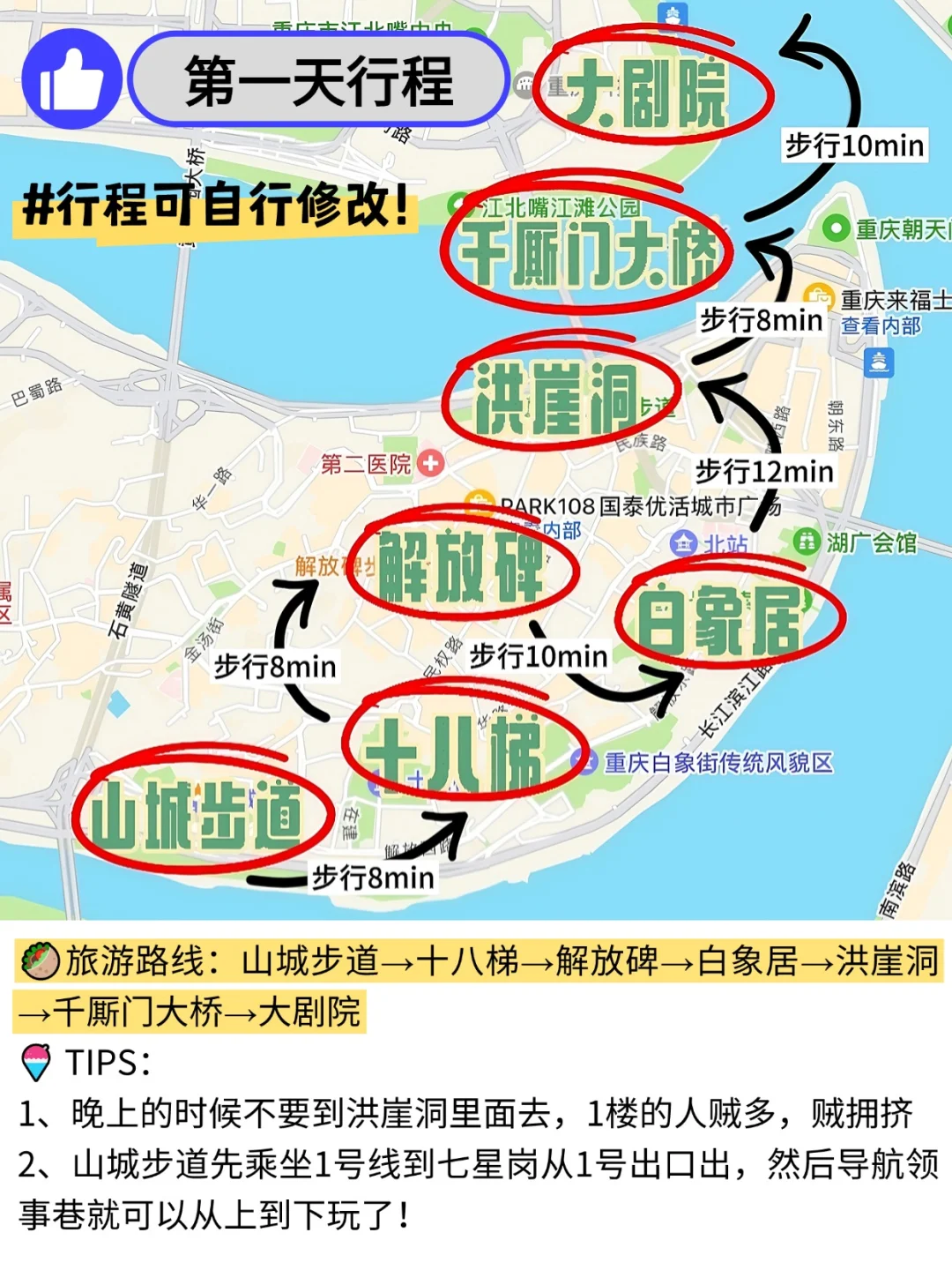 1⃣️山城步道→十八梯→解放碑→白象居→洪崖洞→千厮门大桥→大剧院