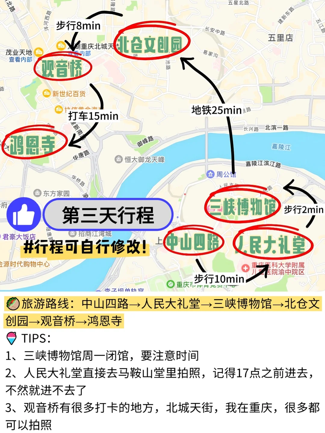 3⃣️中山四路→人民大礼堂→三峡博物馆→北仓文创园→观音桥→鸿恩寺