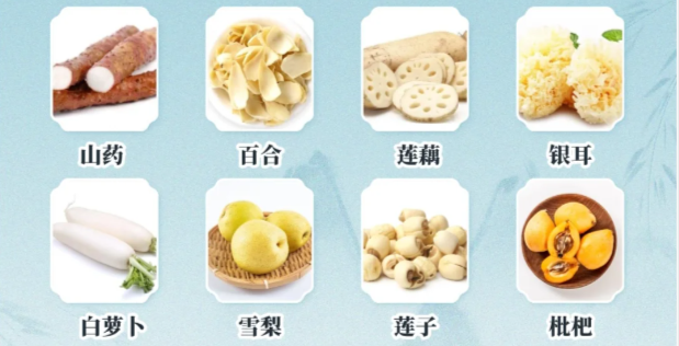 常见的西洋参、沙参、太子参、玉竹、麦冬、芦根、菊花、百合、金银花等,都是一些生津润肺的中药材,平时在家中可以制作一些药膳粥,比如芦根二仁粥、萝卜牛肺二冬汤、黄芪山药粥、百合排骨汤、川贝炖秋梨都是不错选择。