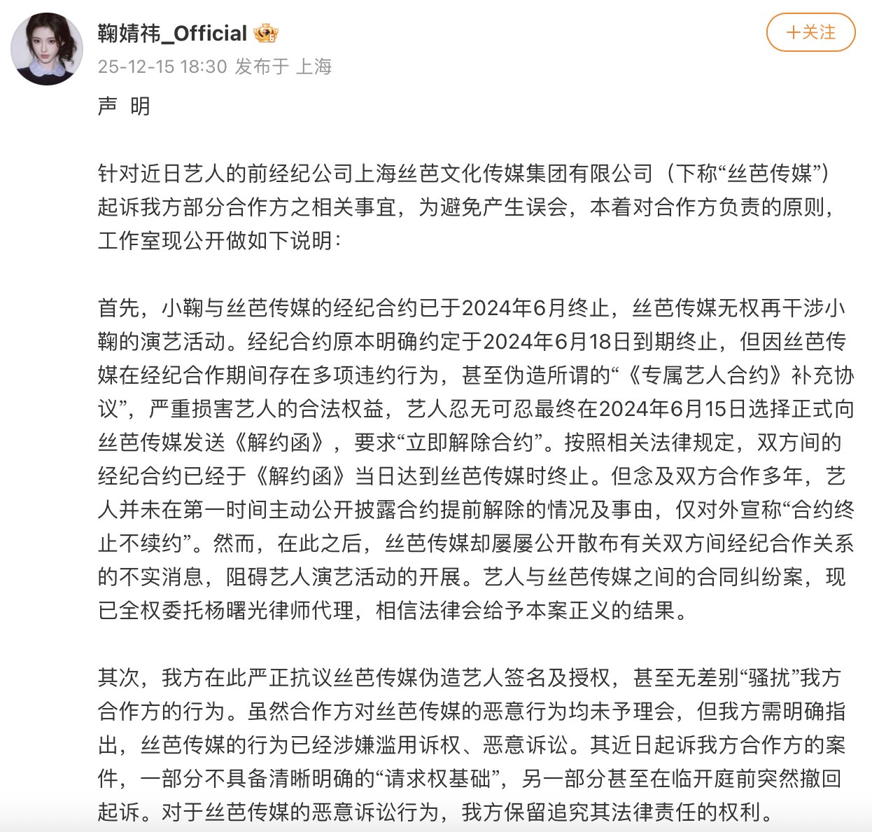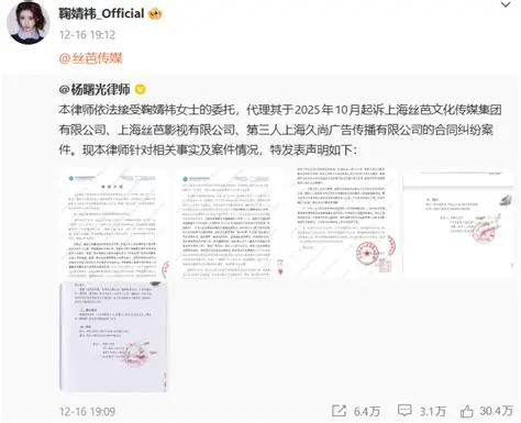 3月31日,艺人鞠婧祎通过官方账号@鞠婧祎_Official 发表声明,回应近期被举报涉嫌偷税漏税一事。她表示,上海橘事顺利影视文化工作室已配合完成相关税务抽查和检查程序,始终严格遵守国家法律法规。同时,鞠婧祎指出丝芭传媒在其演艺事业上发布了不实信息,企图操控舆论,导致其名誉受损。她已委托律师对丝芭传媒的恶意侵权行为提起诉讼,坚决维护自身合法权益。此外,上海市税务局稽查局回应称,未发现举报所反映的涉税问题,将继续加强税收监管,保障合法合规经营者的权益。这一声明引起了公众广泛关注,艺人与公司的纷争也逐渐浮出水面。