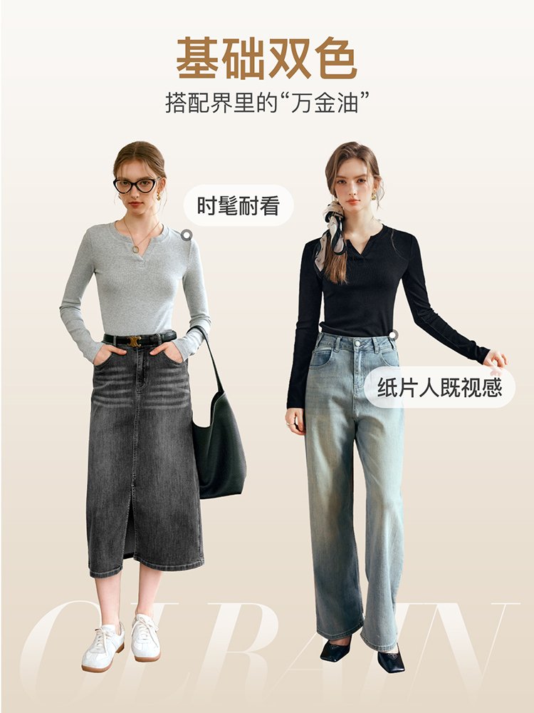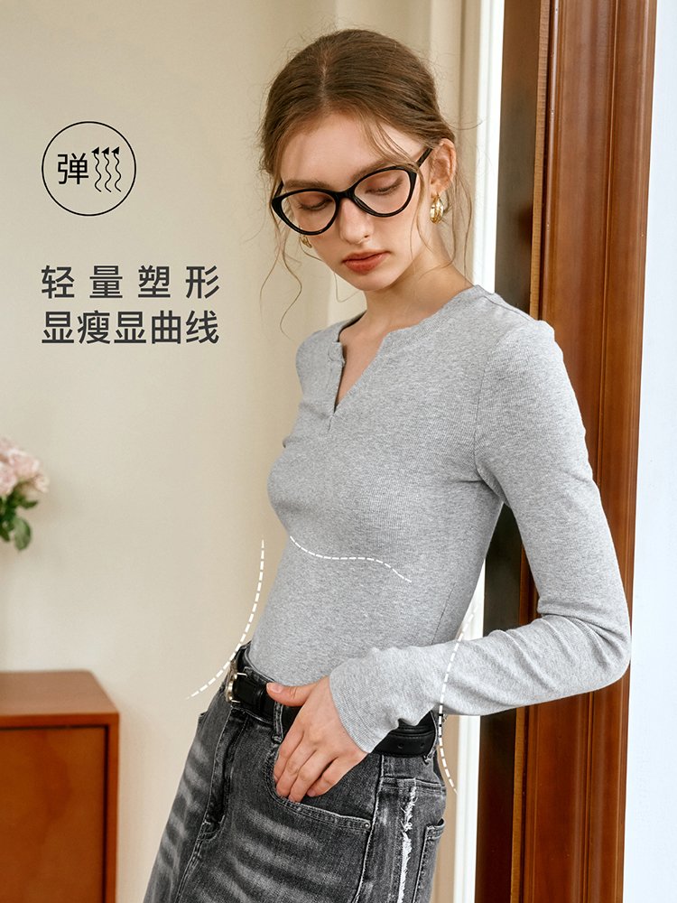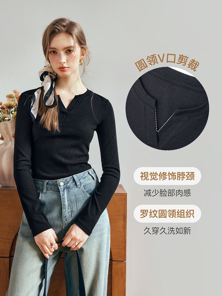 细坑条针织料,肌理清晰细腻,触感柔软亲肤;面料弹性大,穿着舒适透氣,久洗不易变形;圆领+小V领,视觉不显单调,显脸瘦显脖子长;可单穿可内搭,日常通勤皆可,满足搭配需求