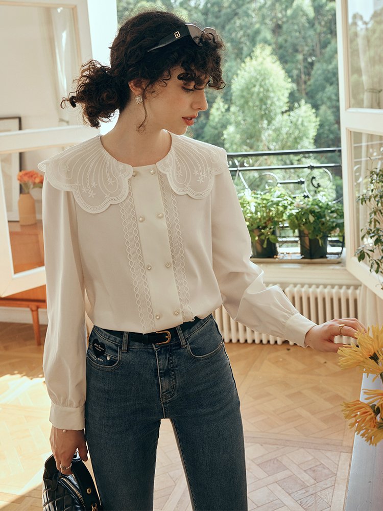 抗’皱性衬衣料,面感平滑,亲肤舒适不扎;不易起球起毛,抗’皱性好易打理,且上身不透;重工定制娃娃领,温柔显气质,显衬脸型小巧;前幅搭配精至蕾丝,与领子相辅相成,精至立体;门襟质感双排扣设计,颗颗精至,细节点睛;正肩微泡泡袖设计,提神显气质,修饰莞美肩形