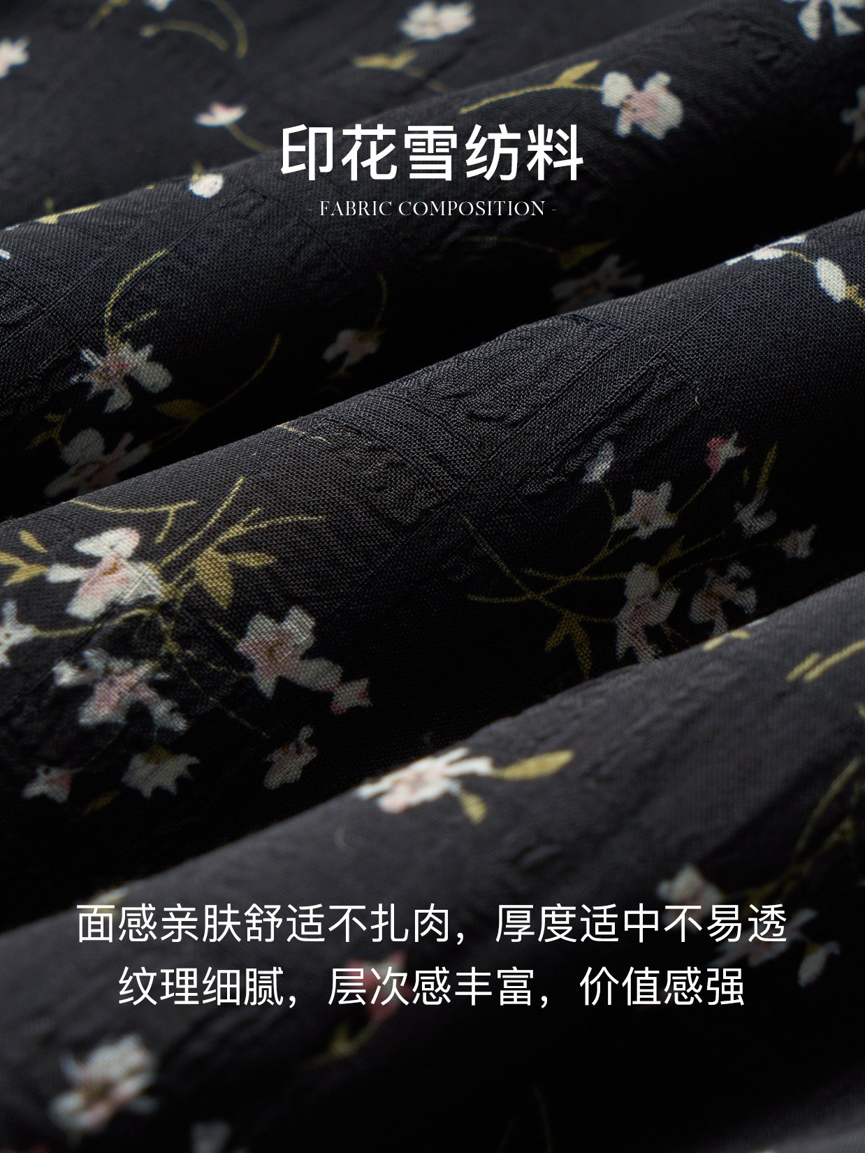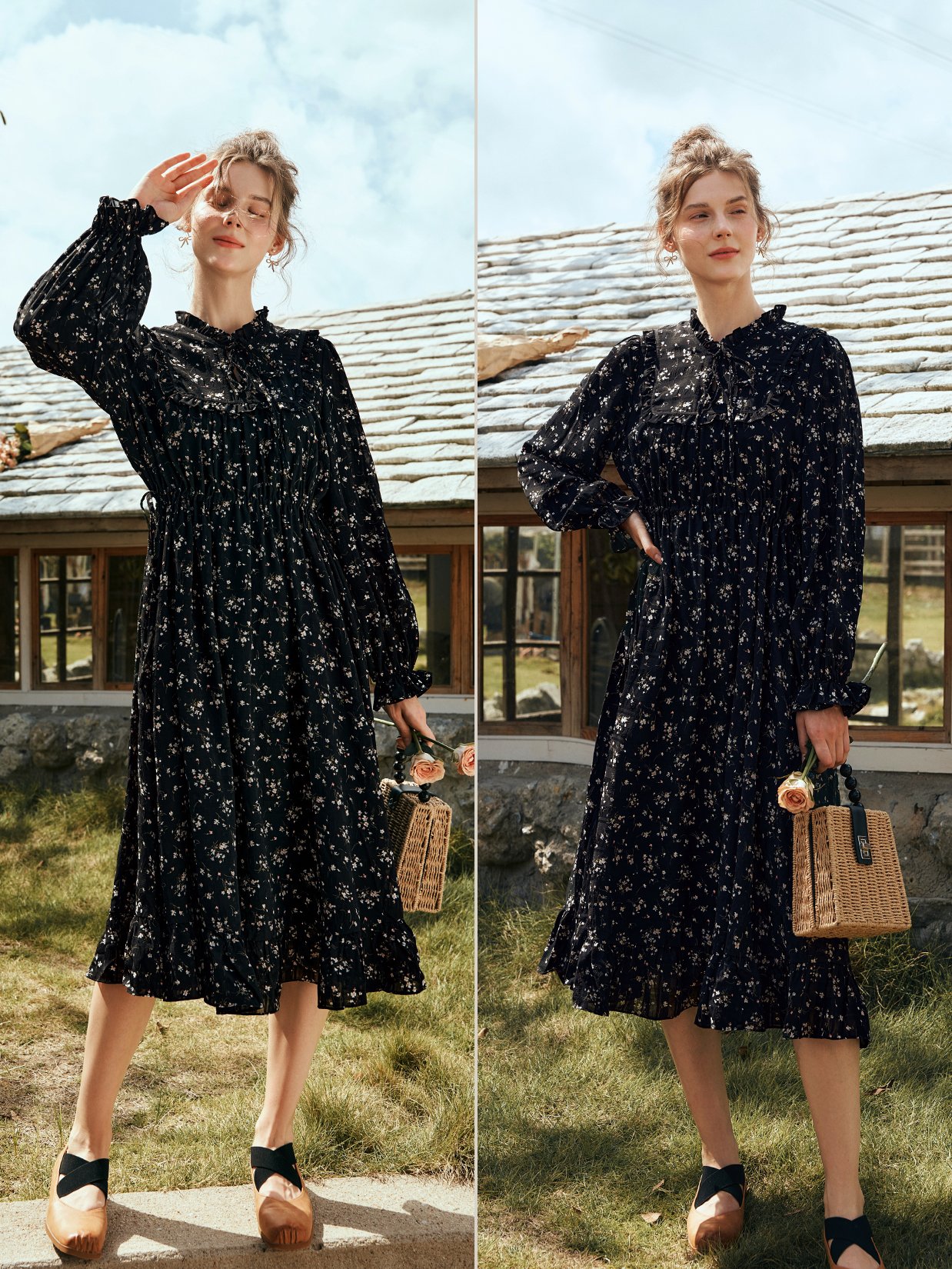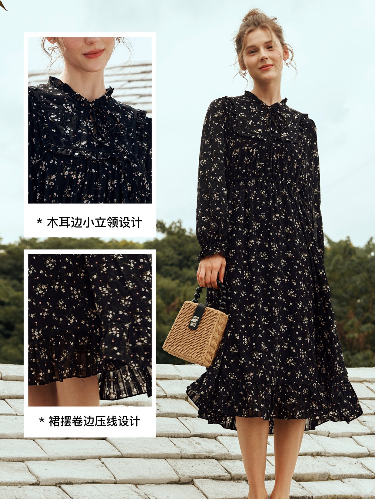 木耳边小立领+系带设计,美化脖颈线条,气质温柔;正肩微泡泡袖,袖口木耳边收口,修饰手腕线条;腰部本布抽绳,可调节宽松度,收腰显瘦显高;黑底花色优雅减龄,可单穿可搭外套,无搭配烦恼