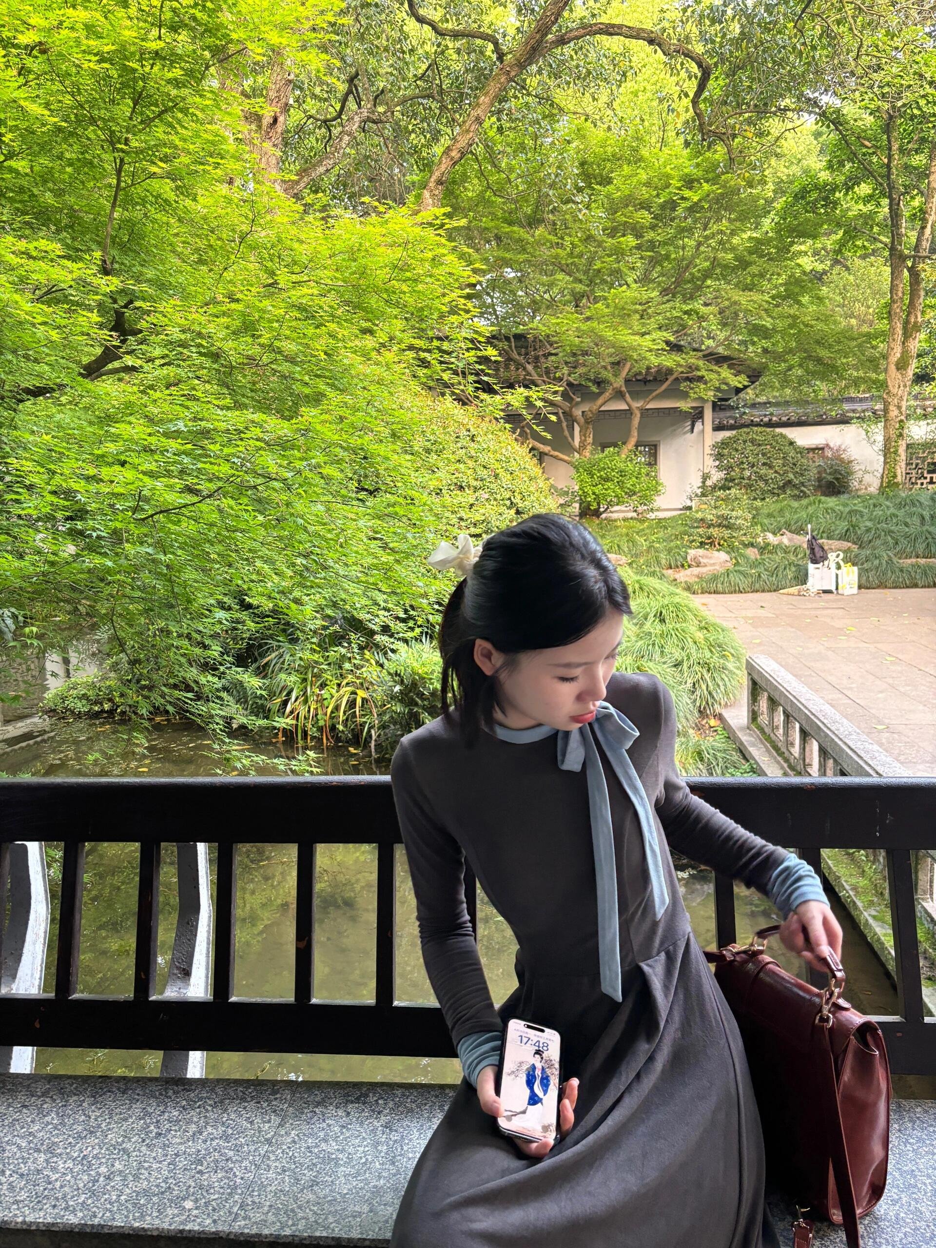 2024秋冬季女装新款长袖蝴蝶结连衣裙