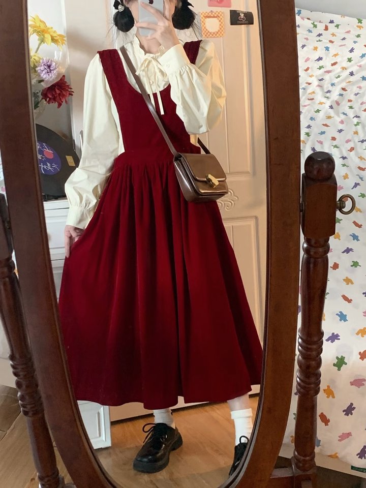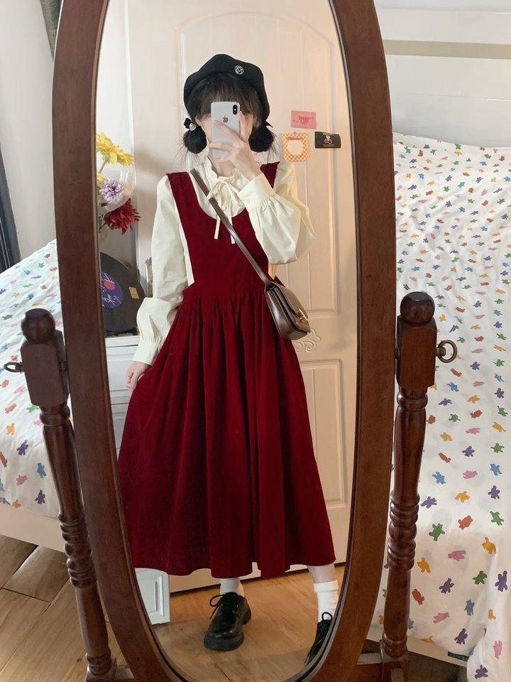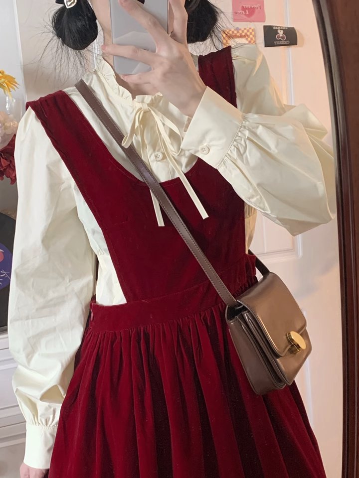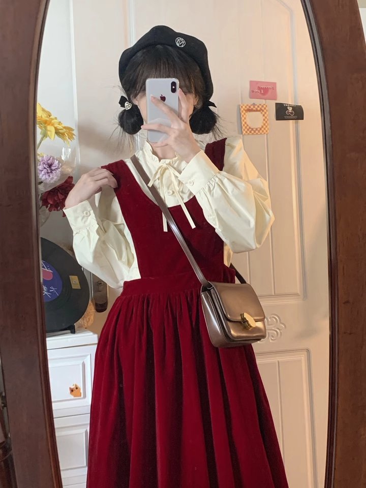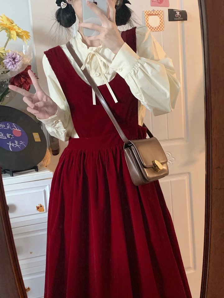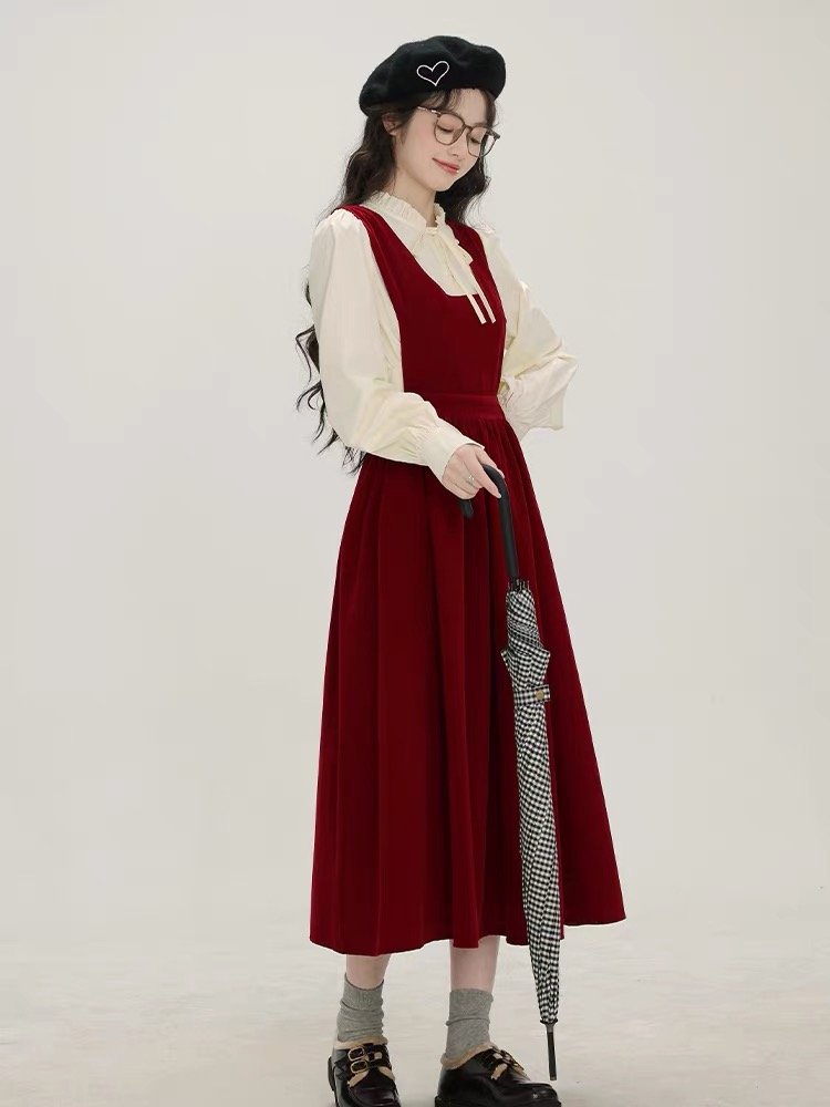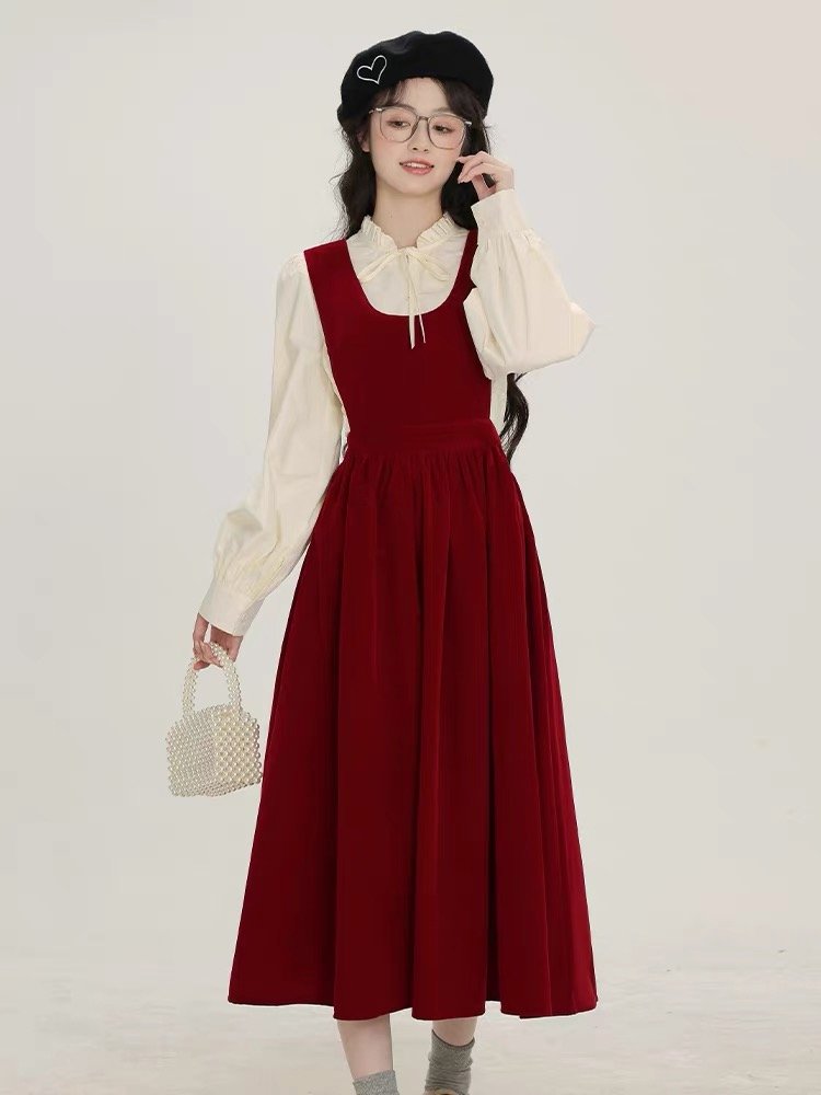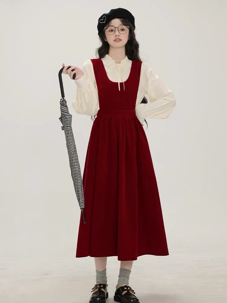 秋冬新款法式搭配一整套装入秋红色吊带裙子