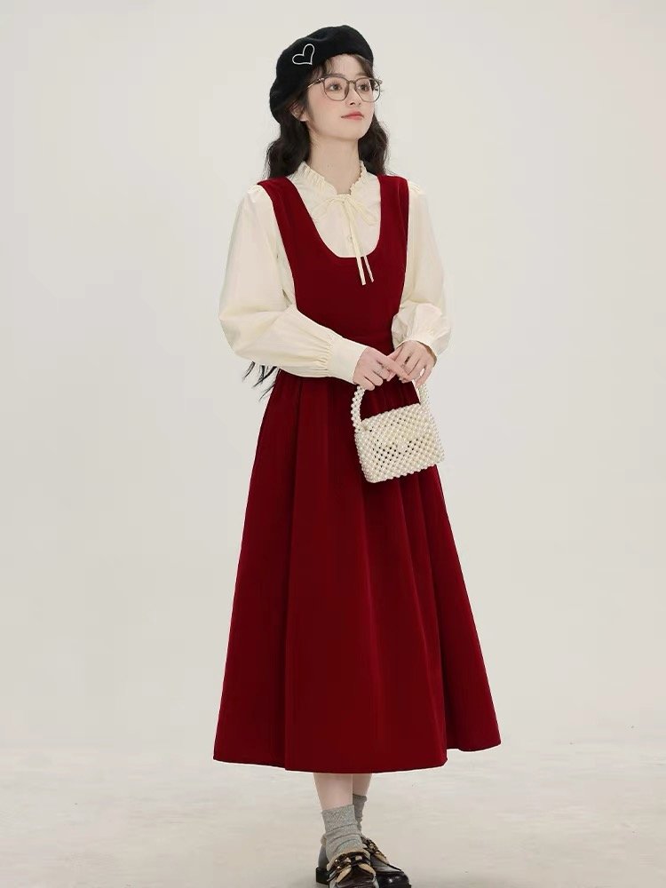 2024秋冬新款法式搭配一整套装入秋季红色吊带连衣裙子女背心长裙