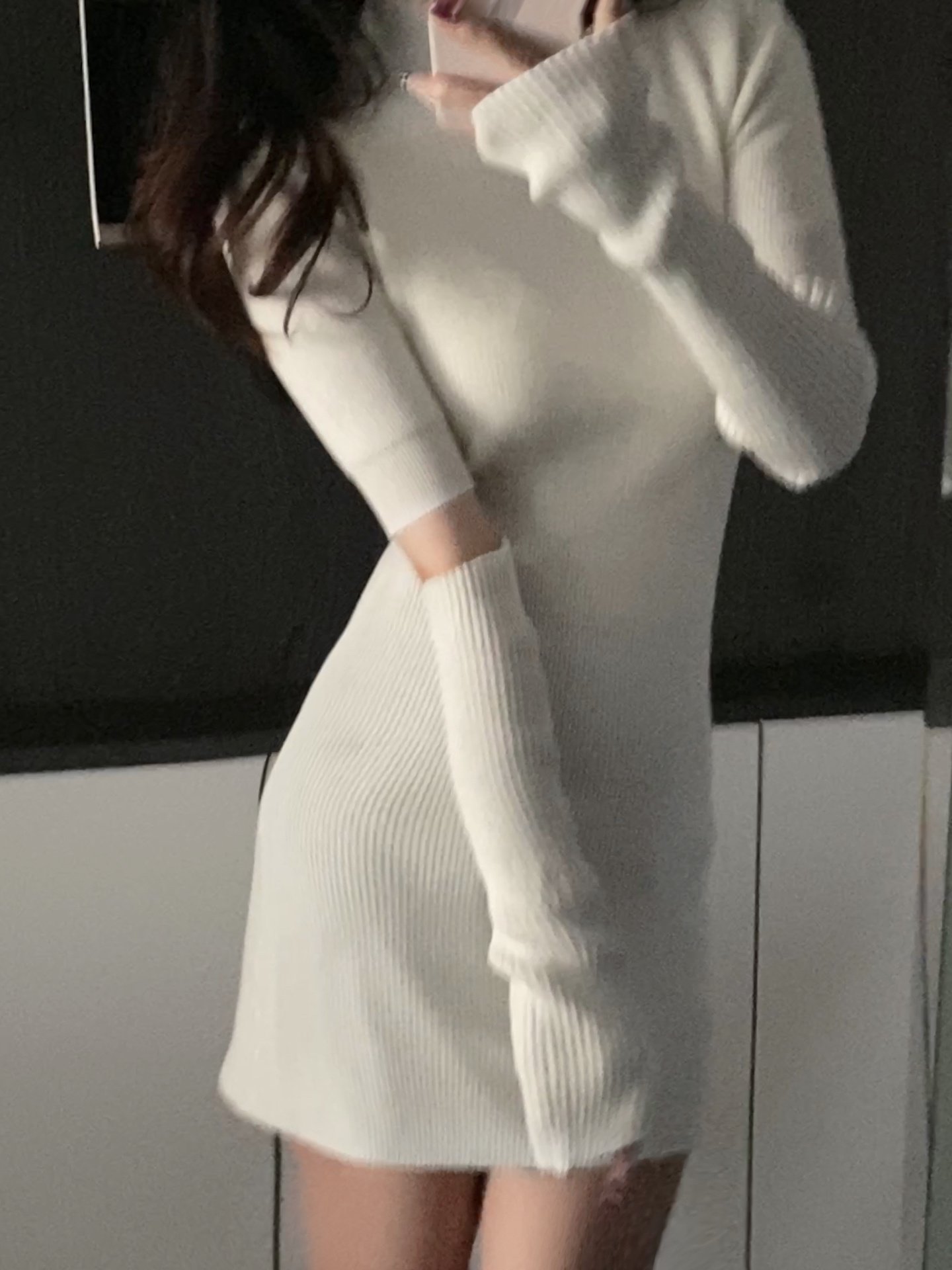 秋冬季白色紧身包臀针织袖套毛衣连衣裙子2024女装新款小个子短裙