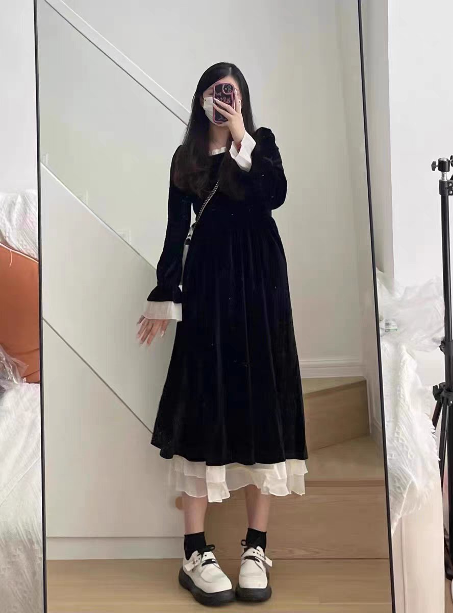 2024年秋冬新款黑色金丝绒连衣裙女宽松赫本风小个子内搭气质长裙