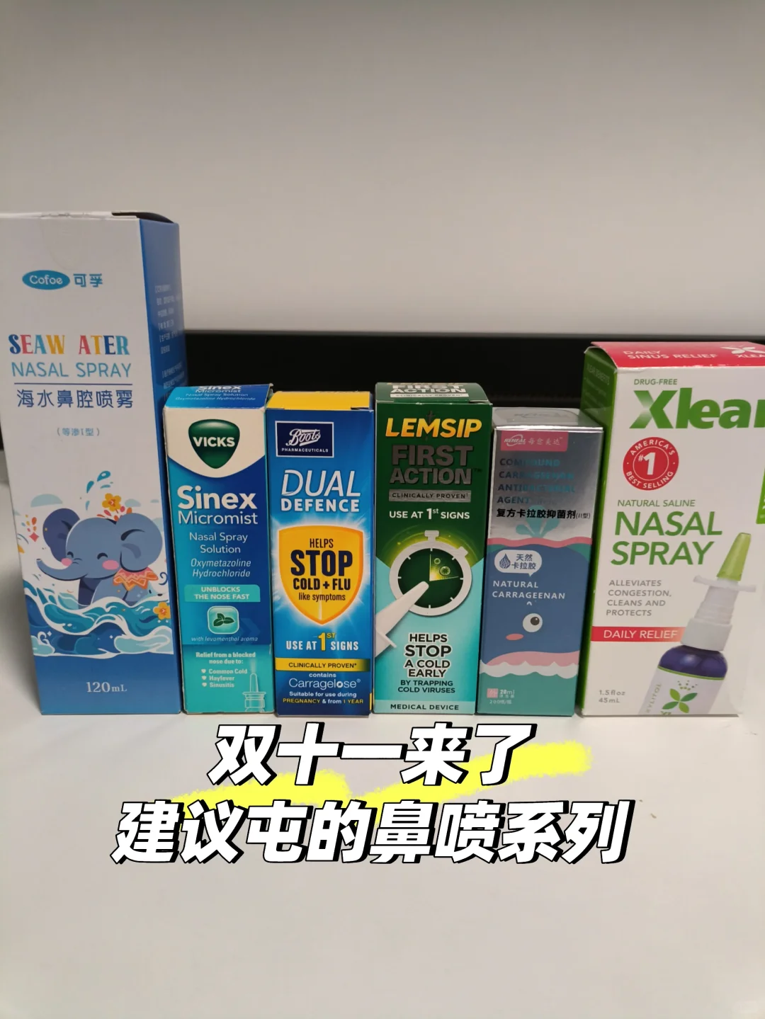 列举了今年常用的几款鼻喷 [星R]三款卡拉胶鼻喷:Dual Lemsip 每愈美达,双11都有好价。 [星R]一款木糖醇鼻喷:Xlear。孩子比较喜欢的甜甜的鼻喷[草莓R] [星R]可持续性盐水喷雾:不限品牌,目前可孚算是比较实惠的。