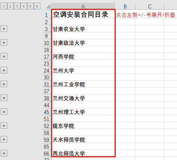 请根据上面数据逆透视生成的两列数据帮我生成一个折叠目录,数据表名为"数据逆透视",数据范围是A1:B61,请从A1开始,一级目录是甲方名称,二级目录乙方名称,三级目录是空调名称,其他类推,请给我生成VBA代码,生成的目录可以方便我折叠和展开。