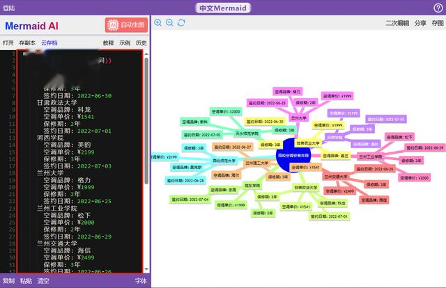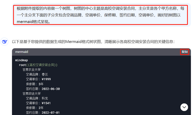 AI画树图树图可以清晰地展示各高校空调安装合同的关键信息,要做一个树图也很简单,继续与DeepSeek对话,输入下面的提示词。