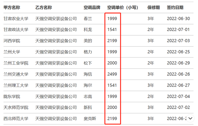 根据附件提取的内容做一个树图,树图的中心主题是高校空调安装合同,主分支是各个甲方名称,每一个主分支下面的子分支包含空调品牌、空调单价、保修期、签约日期,空调单价,画好的树图以mermaid格式呈现。