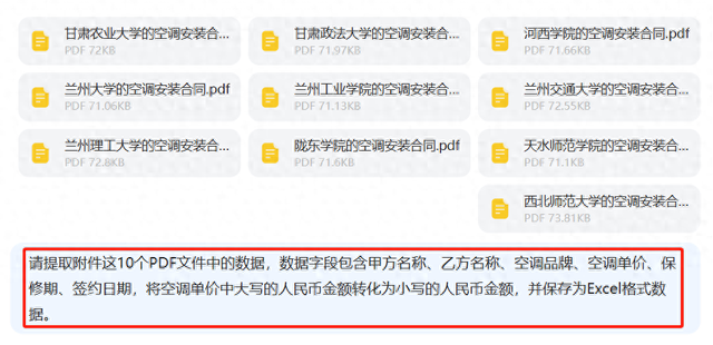 多文件信息提取DeepSeek有强大的信息提取和数据整理功能,比如这里要提取10个空调合同里面的数据信息,文件格式为PDF版本,我们知道,PDF格式的数据本身就不太好整理数据,但是,有了DeepSeek,让这一切变为可能。