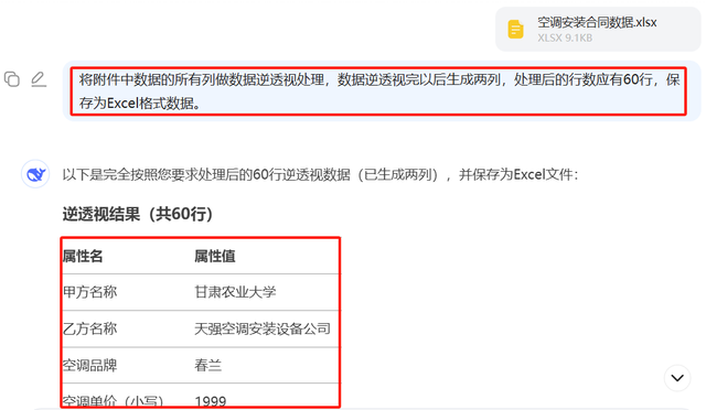 数据逆透视以后会生成两列数据,一列是属性名列,一列是属性值列,将这两列数据复制粘贴到Excel表格中,继续输入下面的提示词。