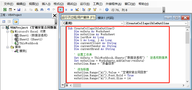将之前生成的VBA代码复制粘贴过来,点击运行按钮。