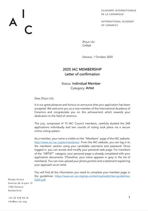 国际陶艺学会是联合国教科文组织非政府合作机构,代表世界当代陶艺领域的最高水平。是全球陶瓷艺术领域公认的最高级别组织。入会申请必须具备广泛的国际交流经验与影响力,且评审程序极为严格,经过15位国际评委的多轮严格评审,钧瓷大师刘志军被正式成为国际陶艺学会的会员,这一重要突破标志着他在陶瓷艺术,特别是在国际交流方面,获得了国际陶艺界的广泛认可。此次加入国际陶艺学会,刘志军以专业艺术家身份加入该学会的,进一步彰显了他在陶瓷艺术创作方面国际化进程中取得的显著影响力。