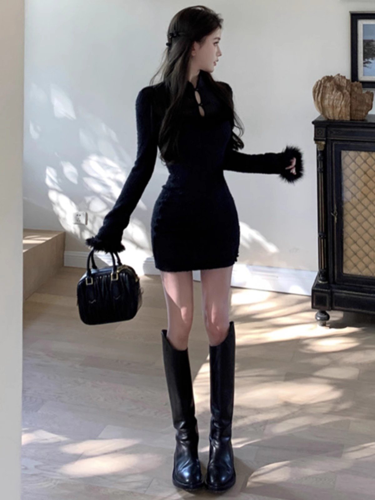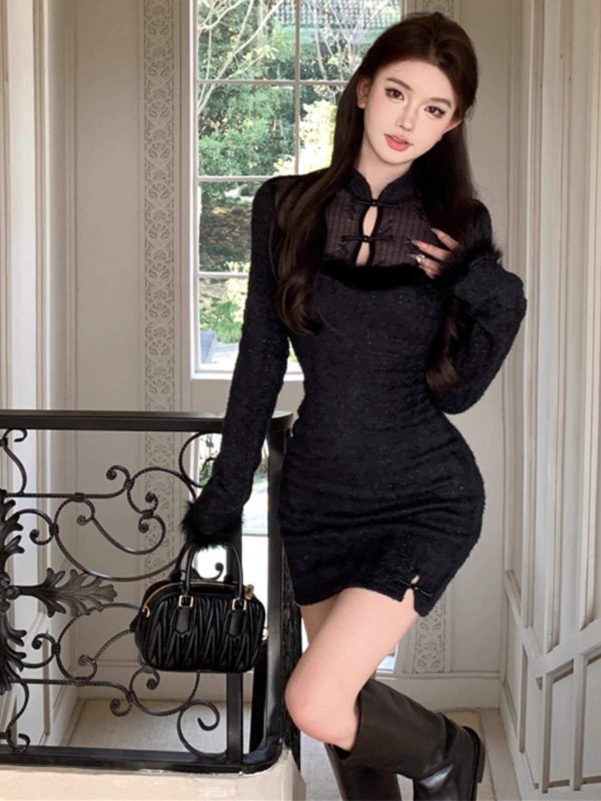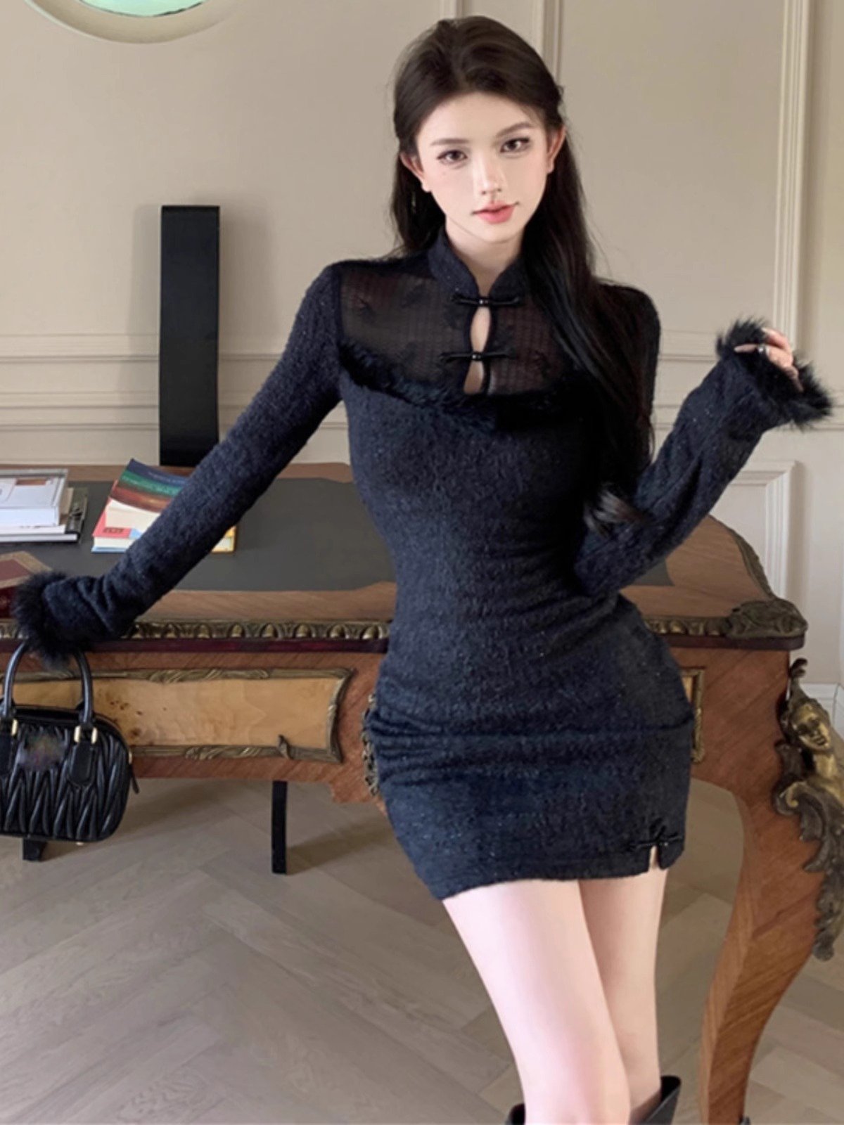 新中式国风改良旗袍黑色内搭连衣裙女秋冬季
