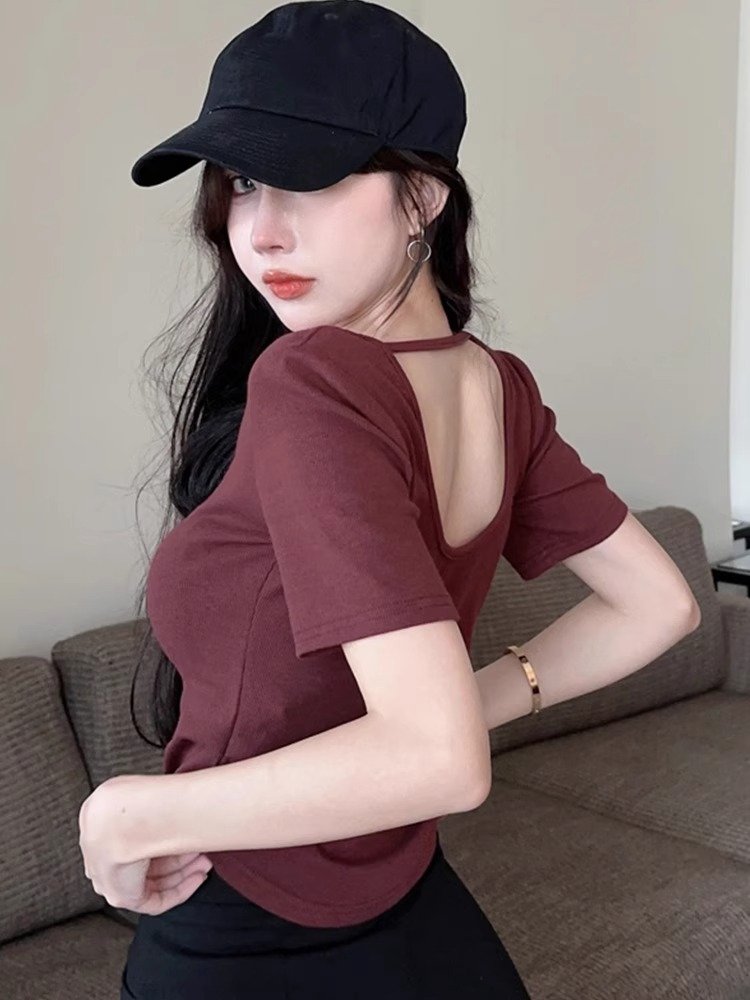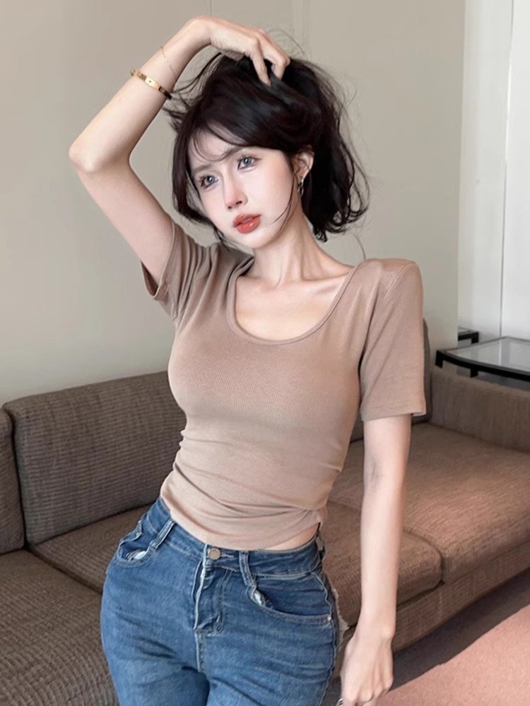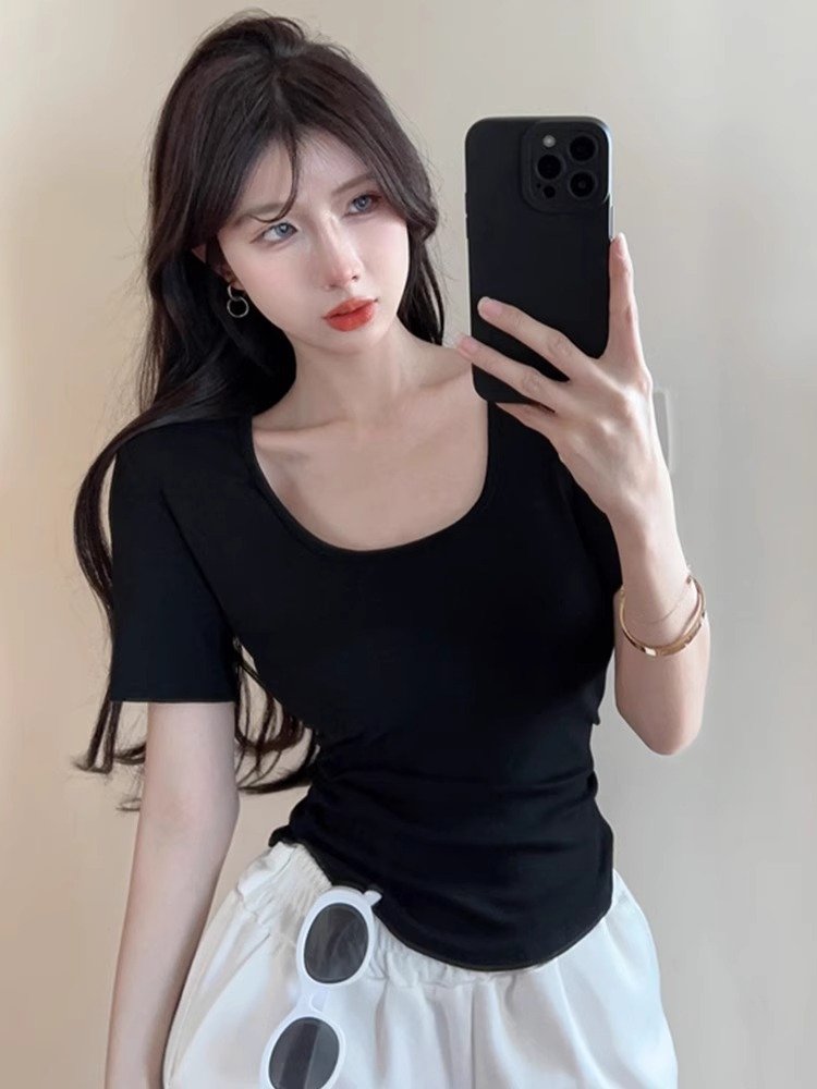 夏季白色u领正肩短款T恤女短袖设计感小众