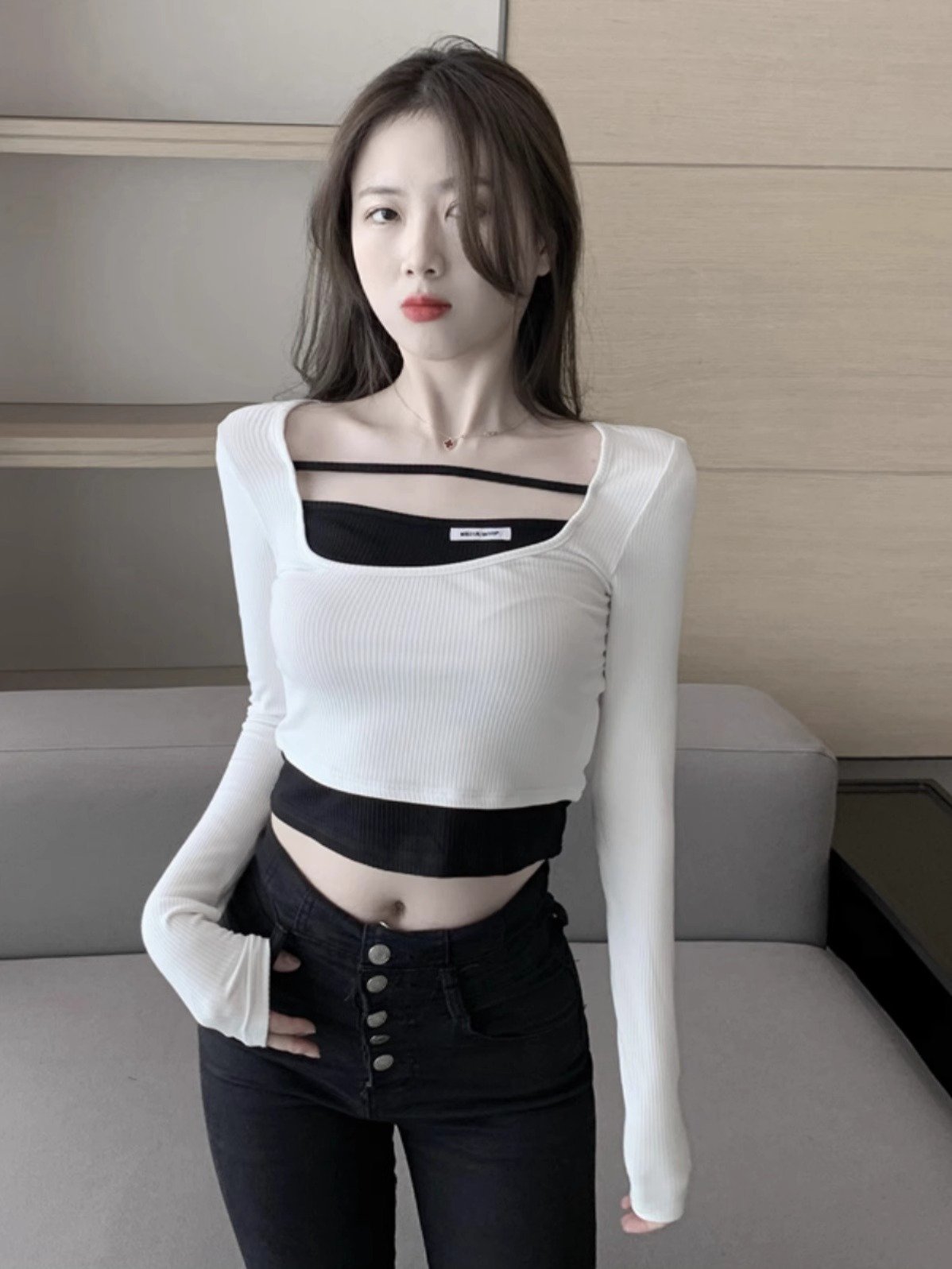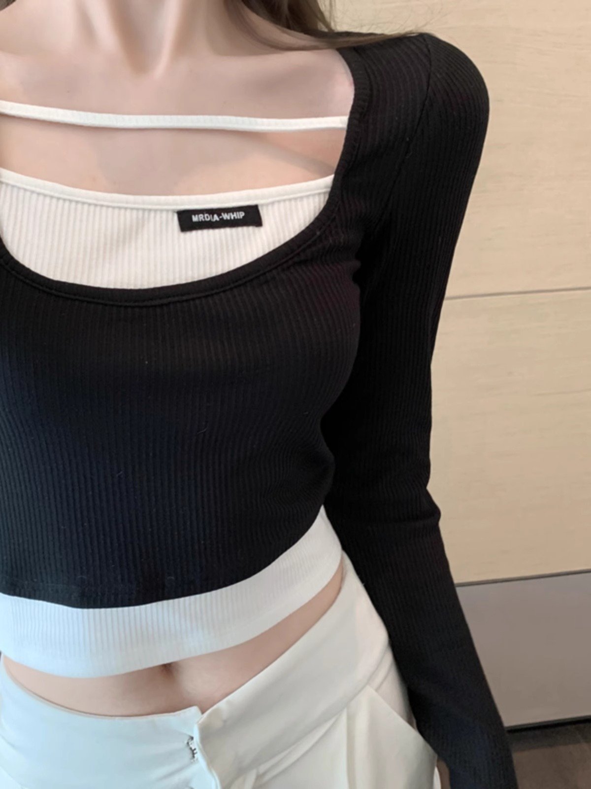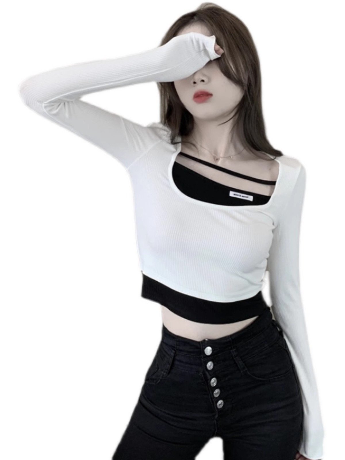 假两件短款上衣女春秋长袖内搭方领打底衫设