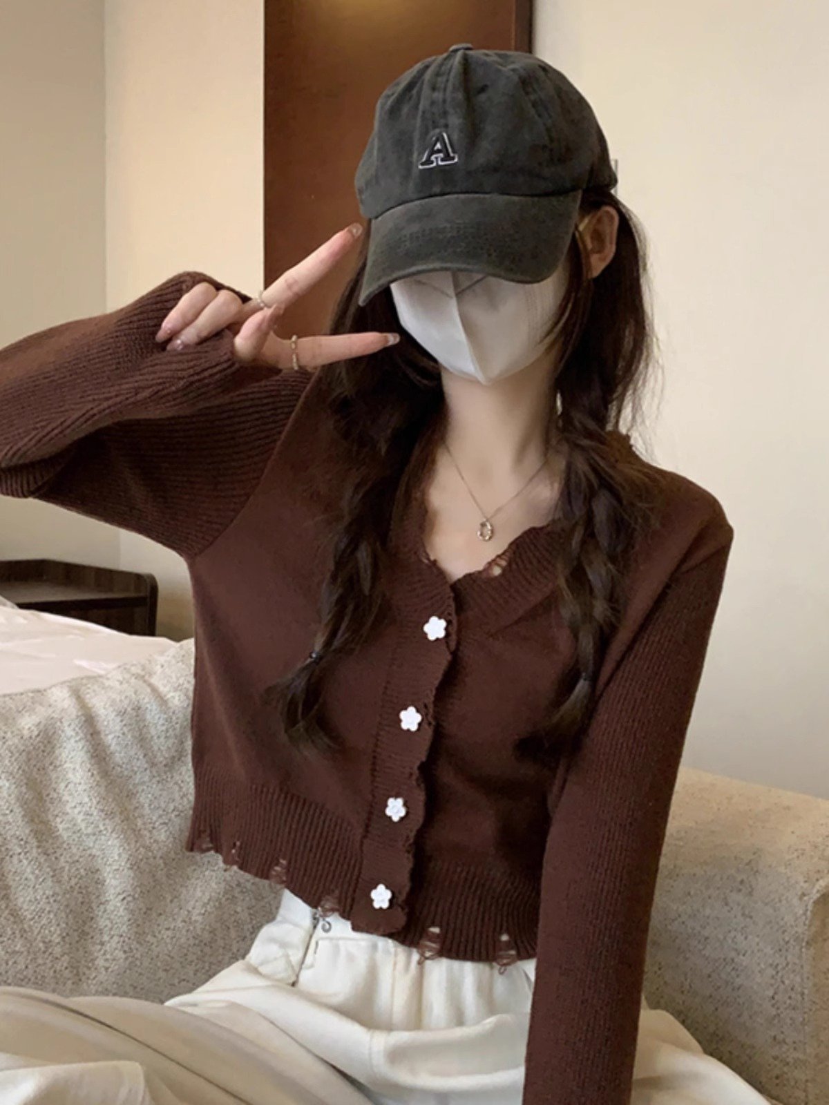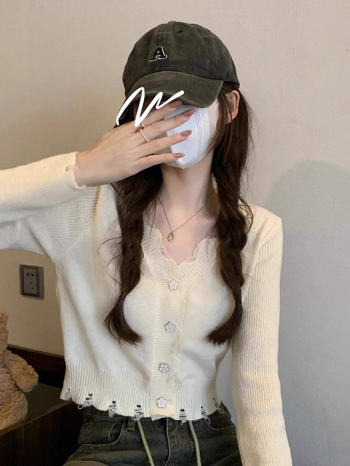 白色V领长袖T恤女早秋穿搭掐腰短款修身内
