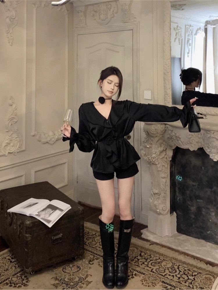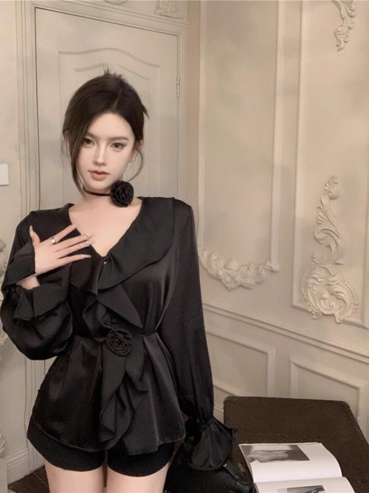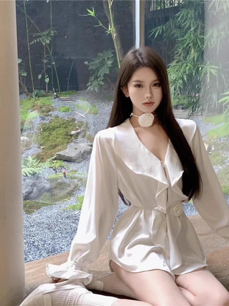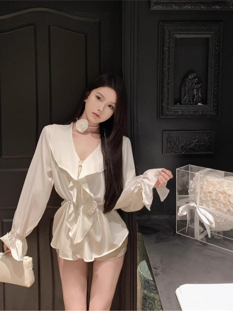 白色高级感v领缎面衬衫女早秋季性感收腰设