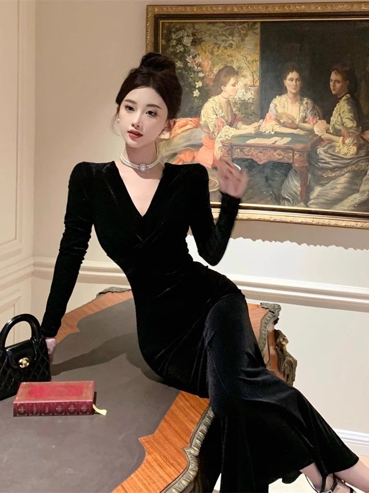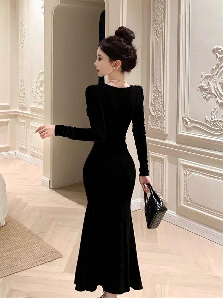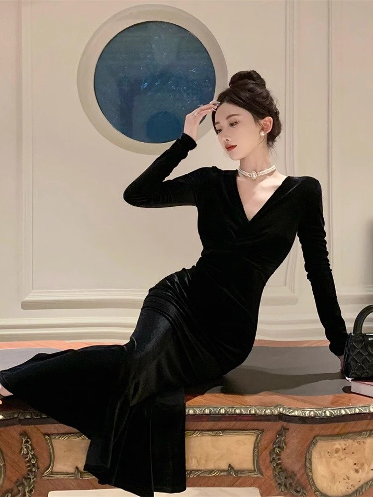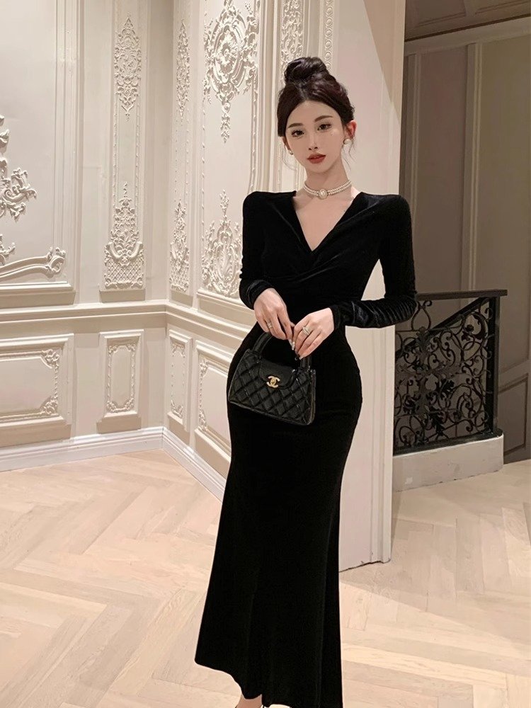 法式赫本风黑色丝绒连衣裙女秋冬季气质高级