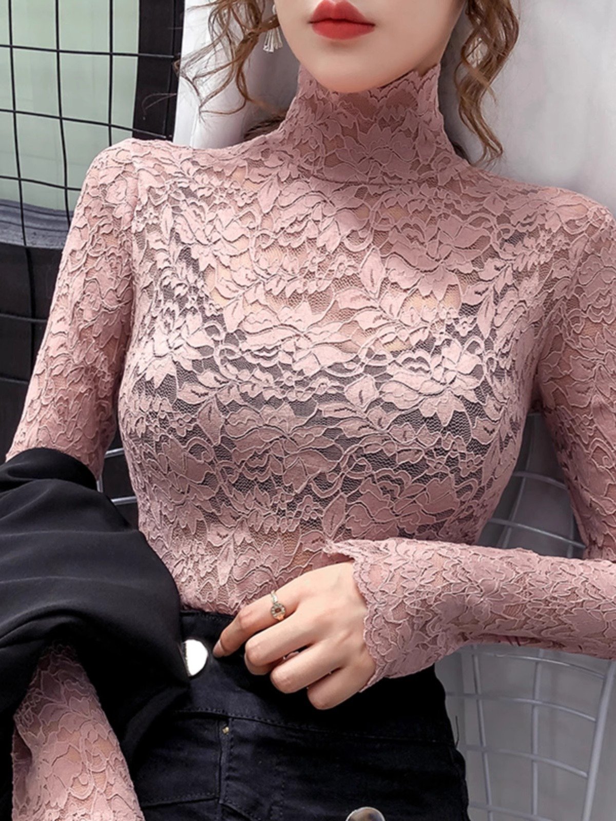 黑色高领蕾丝打底衫女秋冬季紧身内搭网纱高