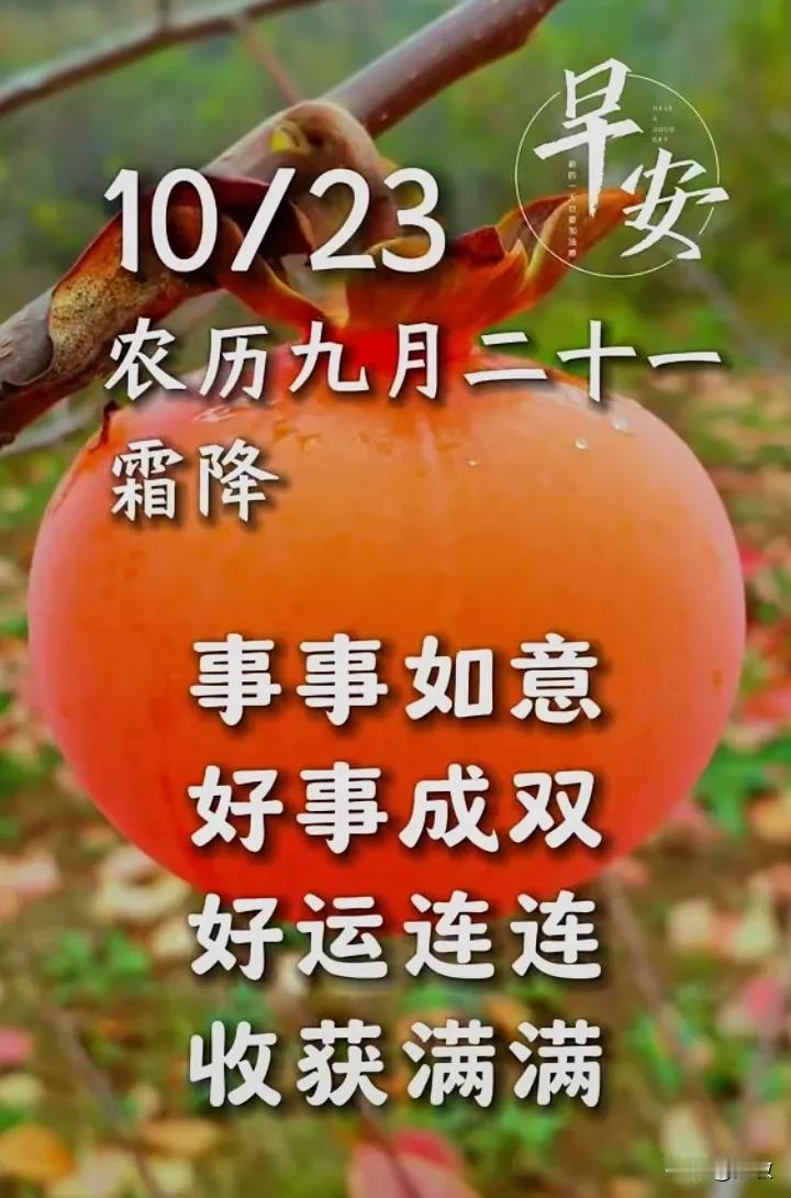 10月23日星期三,今天是二十四之第十八,秋季最后一节气“霜降”, 早安吉祥! 天气更冷了秋天也就结束。风儿担心大地冻着,要盖上一床厚厚的落叶,知会你寒从脚下起,阴风颈部入,这个阴盛阳衰的节气,大家都要格外小心天气变化无常添衣裳,千万别冻着别受寒。祝你好柿成“霜”,喜从天“降”身体健健康康得。
