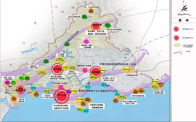 规划沿市域北部山区、中部丘陵地区和南部滨海地区建立三条产业带,重点发展对接珠三角产业配套的基地经济,形成六大产业基地。