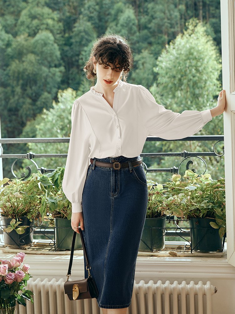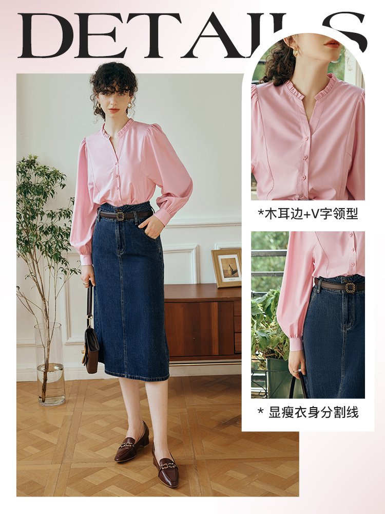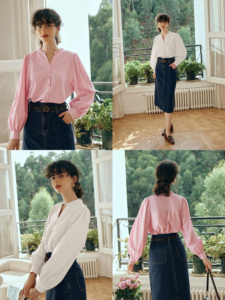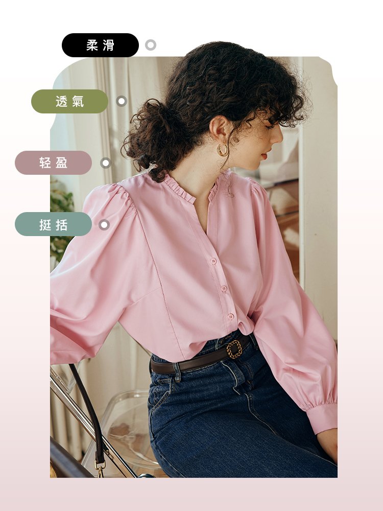 混纺梭织面料,亲肤透氣,柔软舒适抗’皱;悬垂感好,有廓形,不易起静电,方便打理;圆领木耳边+小V字领口,修饰优雅颈线;前中门襟配色单排扣点缀,美观好穿脱;衣身獨特分割线,解构式立裁,视觉更显瘦;肩部捏褶修饰肩线,灯笼袖藏肉显瘦,自在不束缚