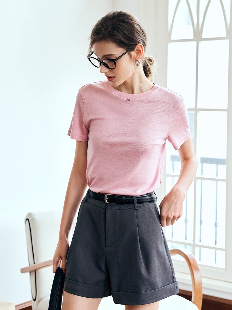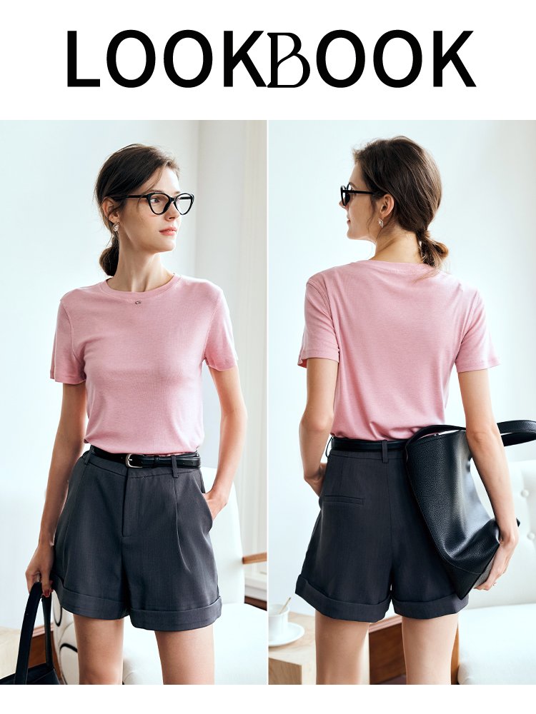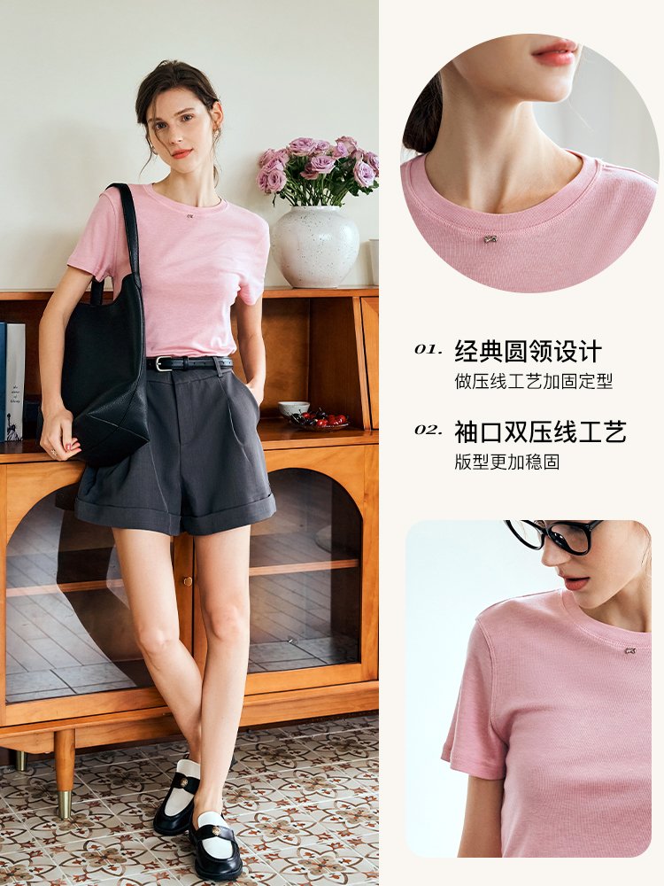 环葆针织面料,亲肤透氣,柔软舒适有型;经典圆领不挑人,修饰脖颈线条,简约大方;领边金属饰品点缀,精至趣味,时尚点睛;粉色显白提’亮肤色,年轻减龄抬气色,不挑肤