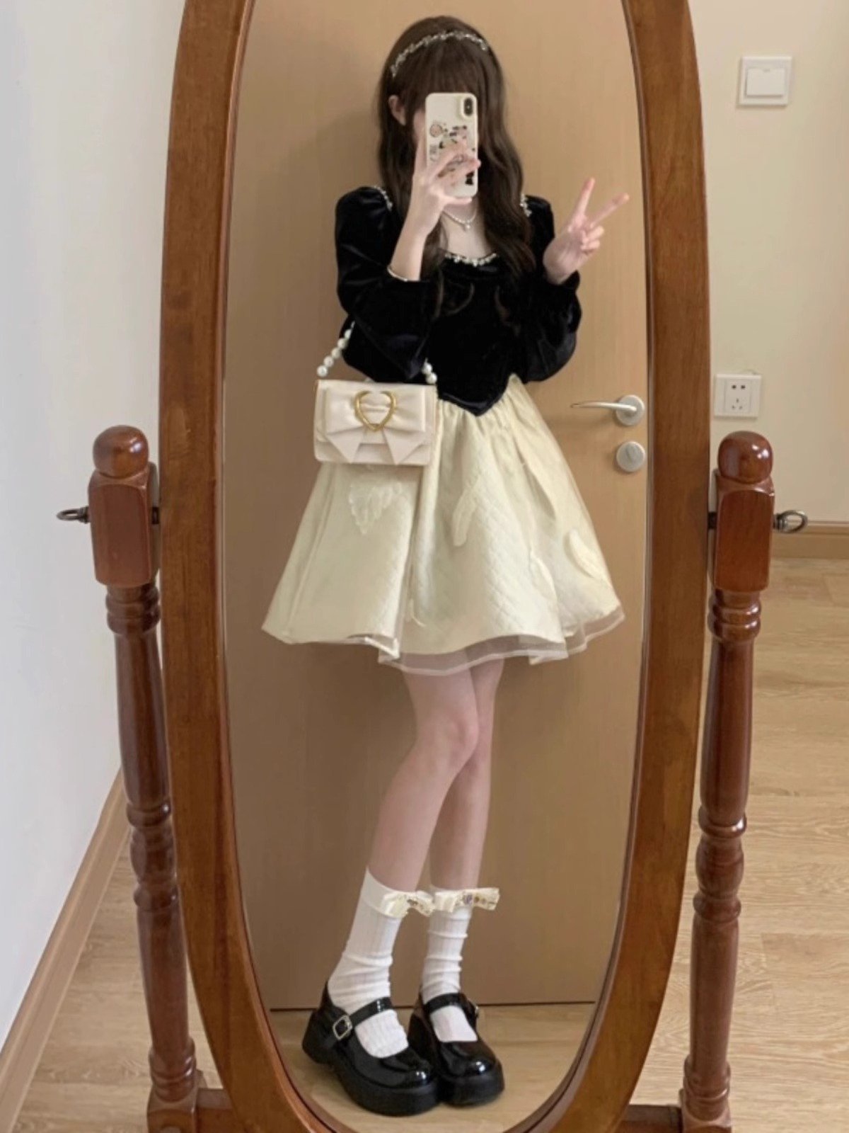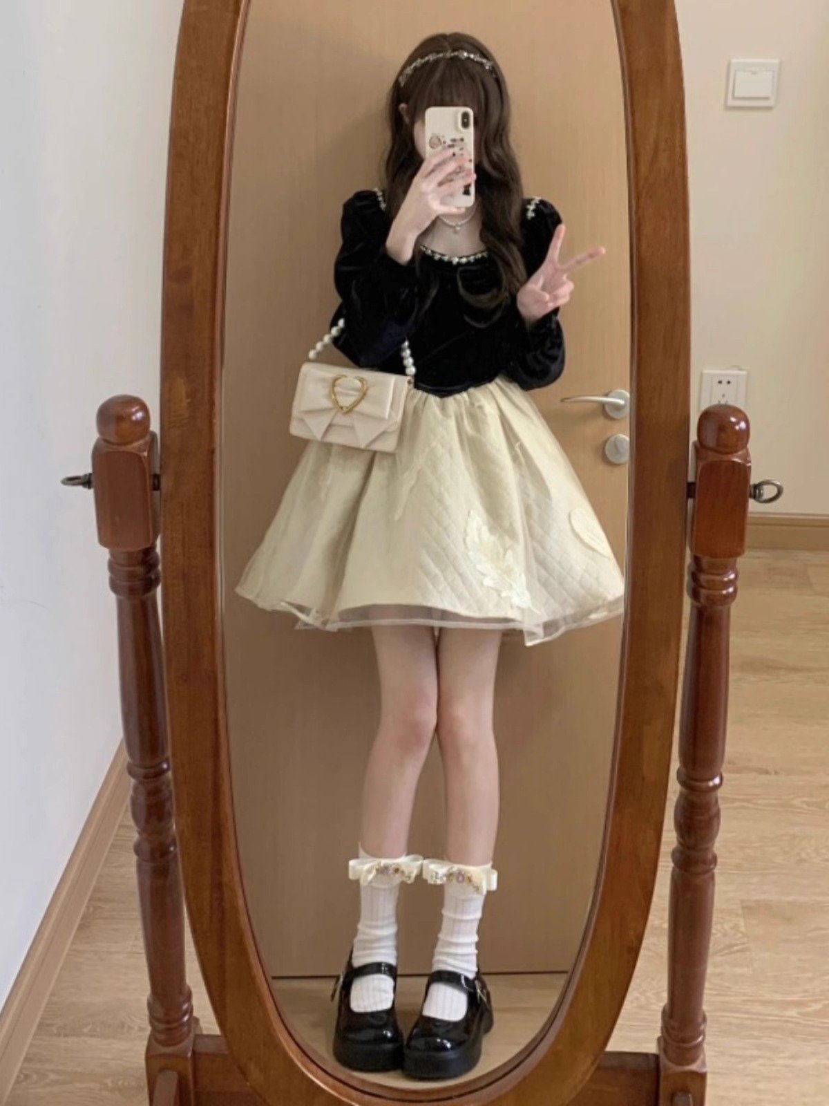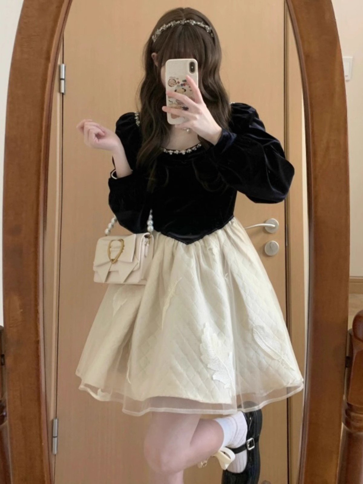 法式千金风黑色丝绒连衣裙女秋冬季高级感公