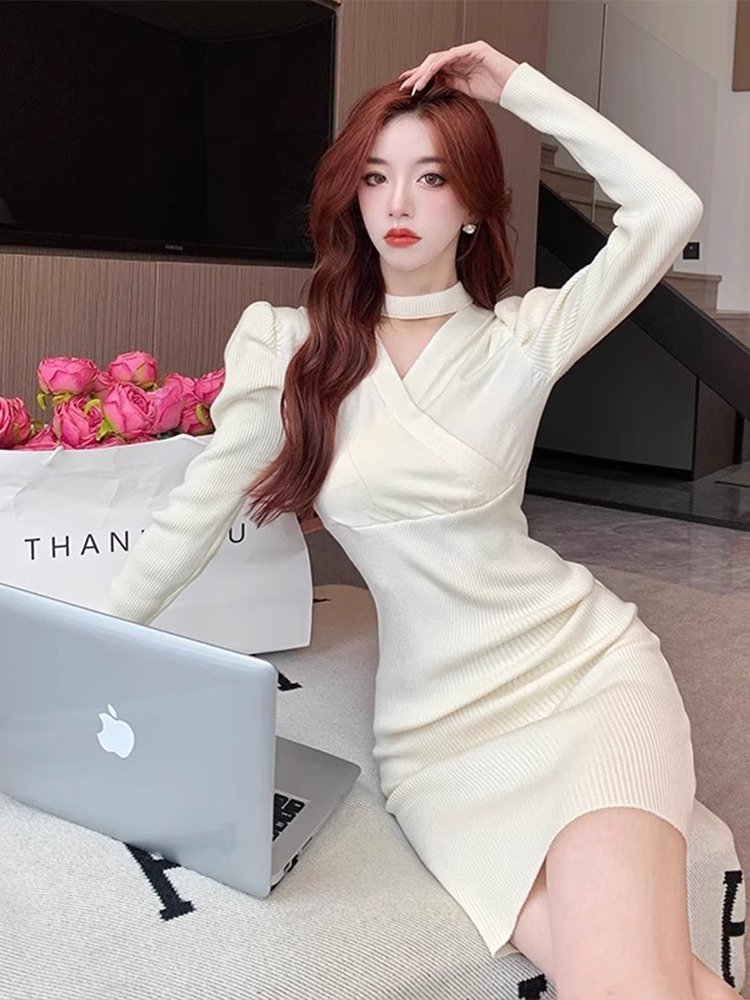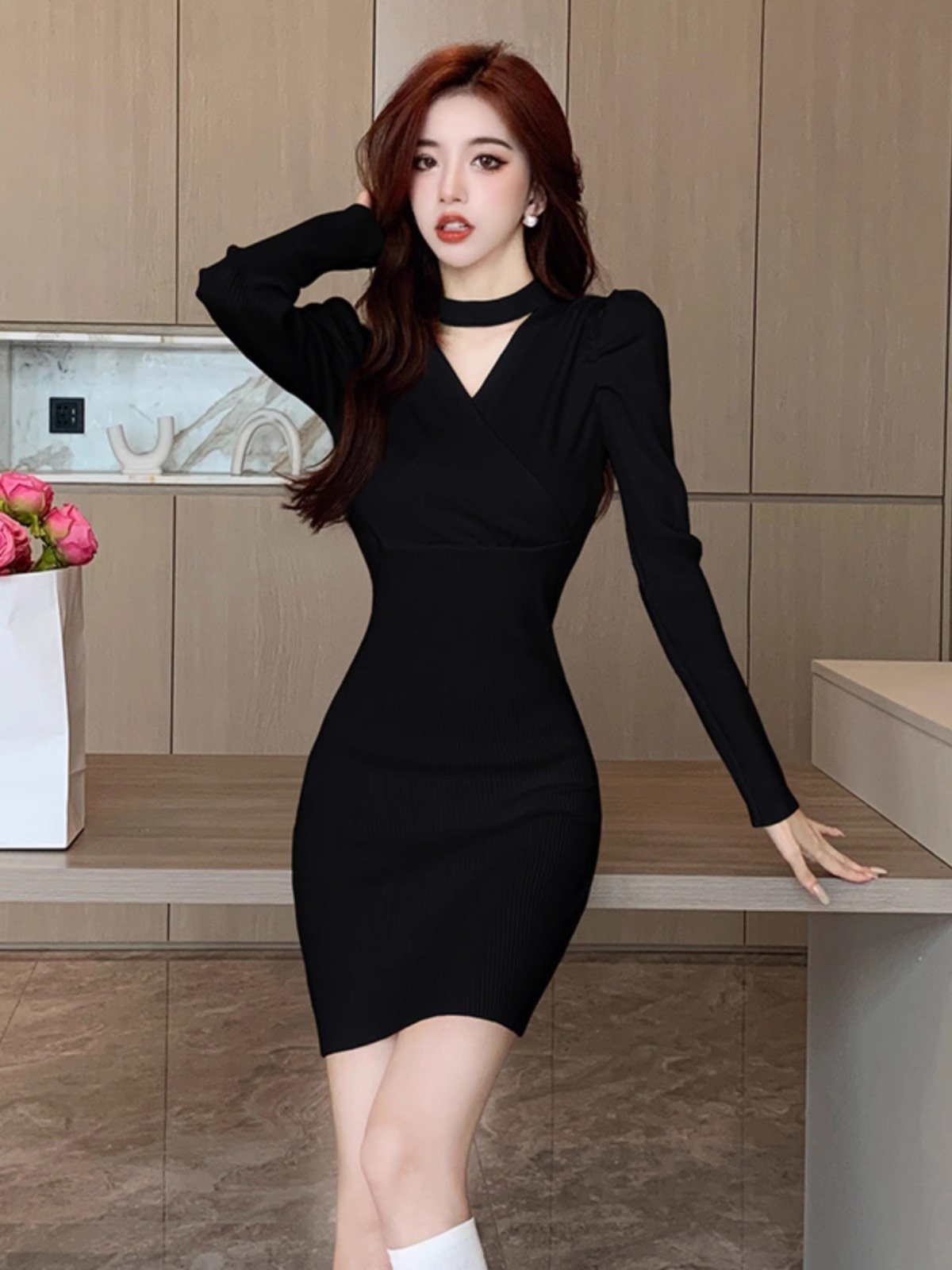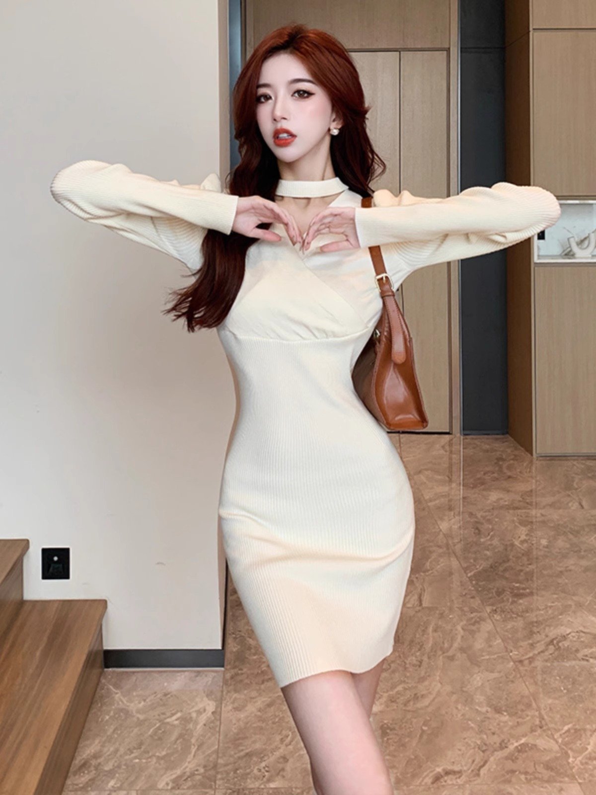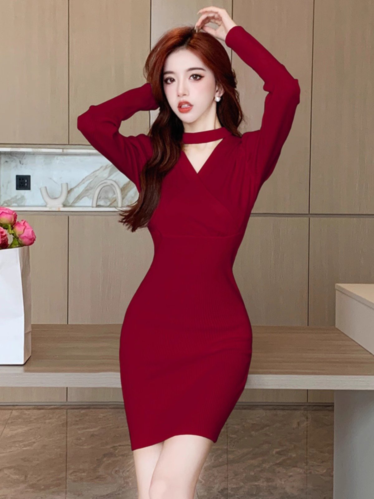 性感红色挂脖针织连衣裙女早秋季高级感内搭